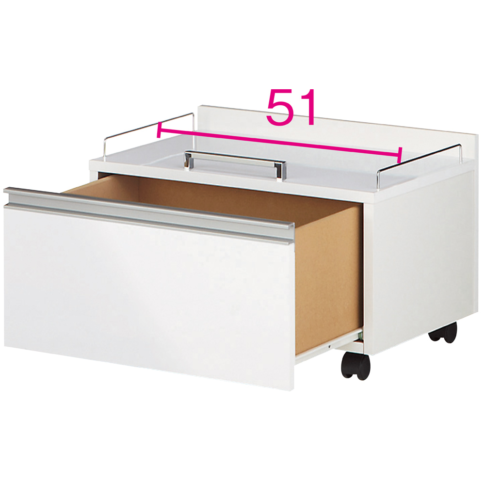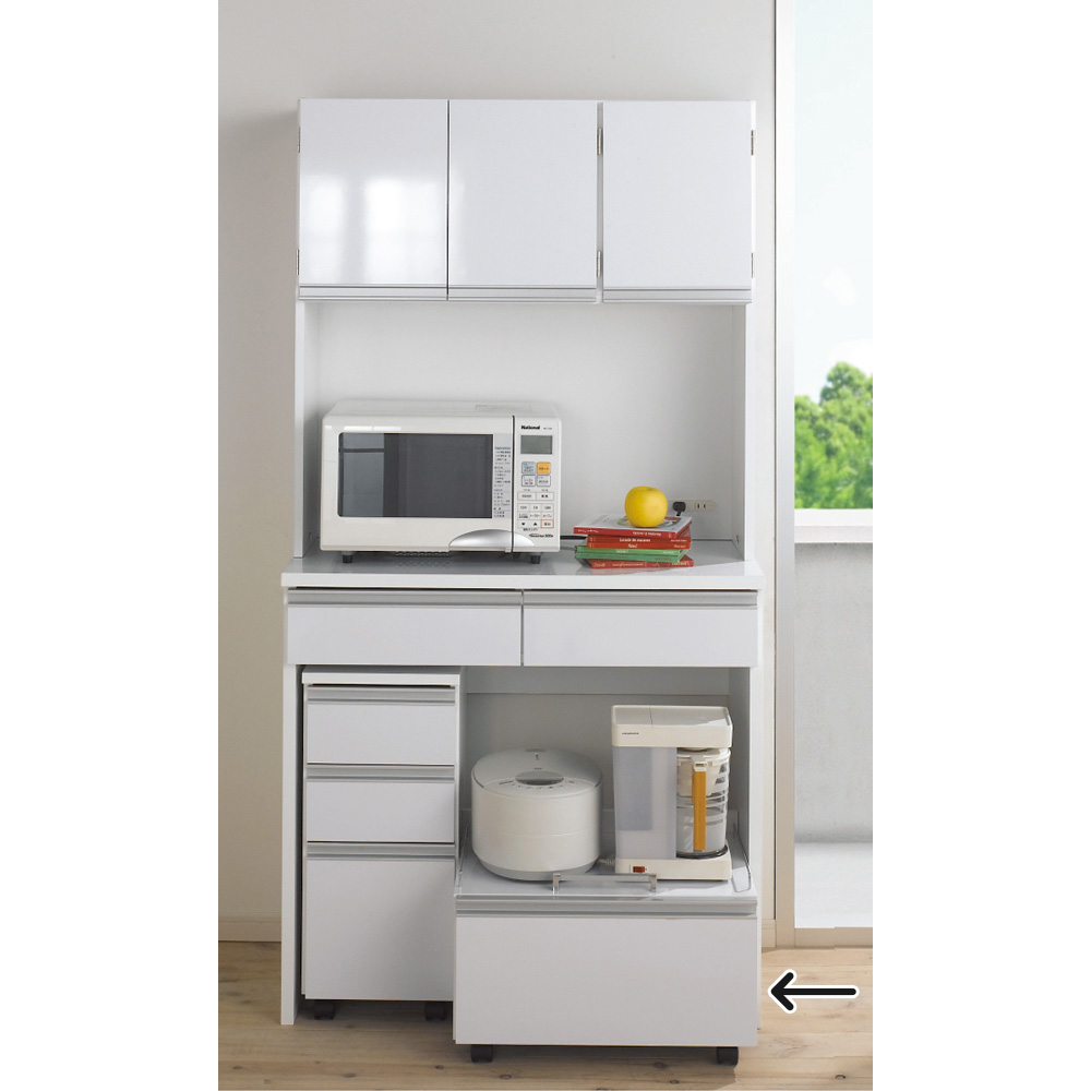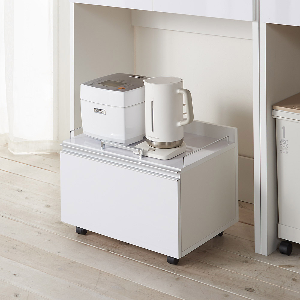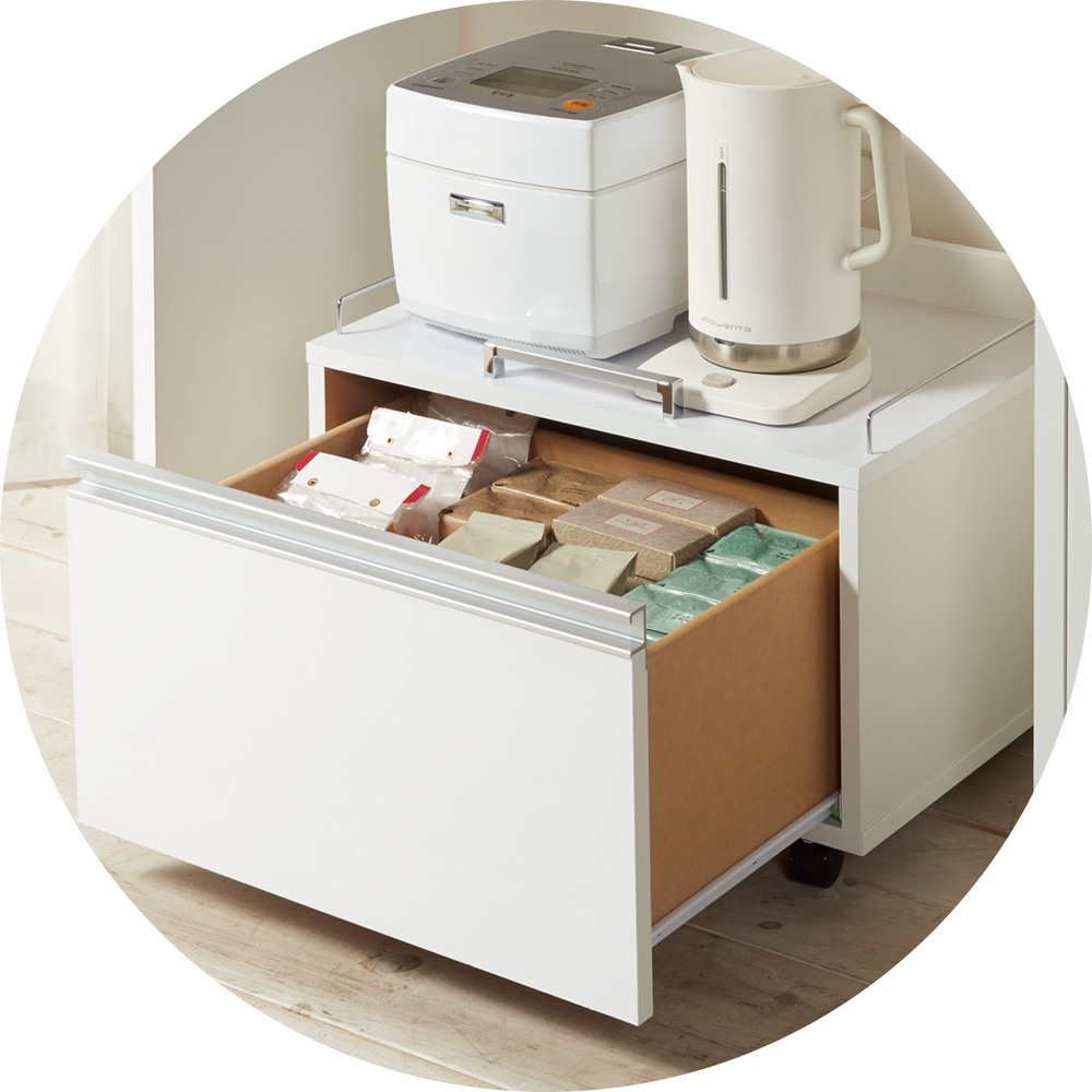 シリーズ商品のカウンターやキッチンボードの下に収納できる、引き出し付きワゴン。天板は家電を置くのにも便利。キャスター付きから、移動もラクラク。