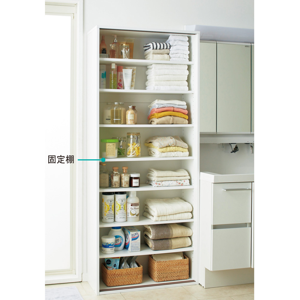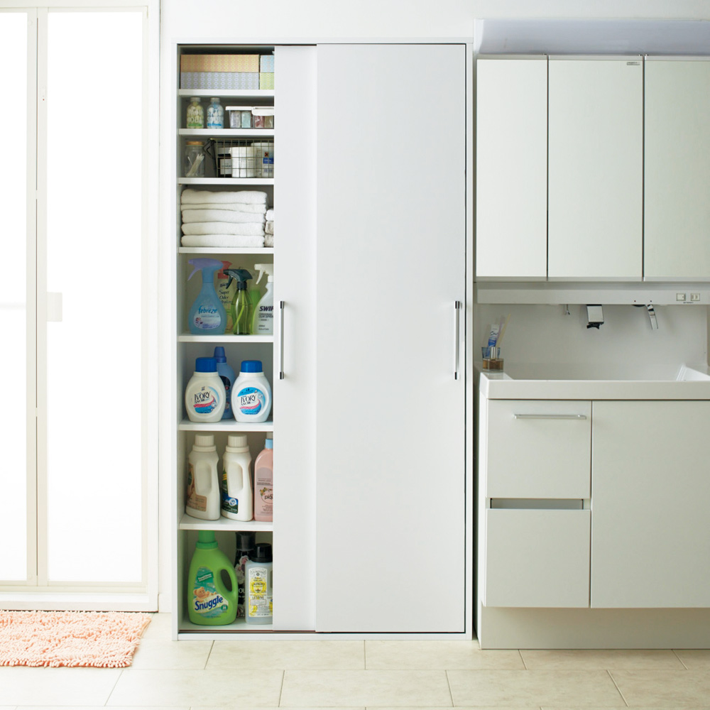 背の高いボトルから、リネン系や洗面小物まで大容量に収納。(※写真は幅90cmタイプです)