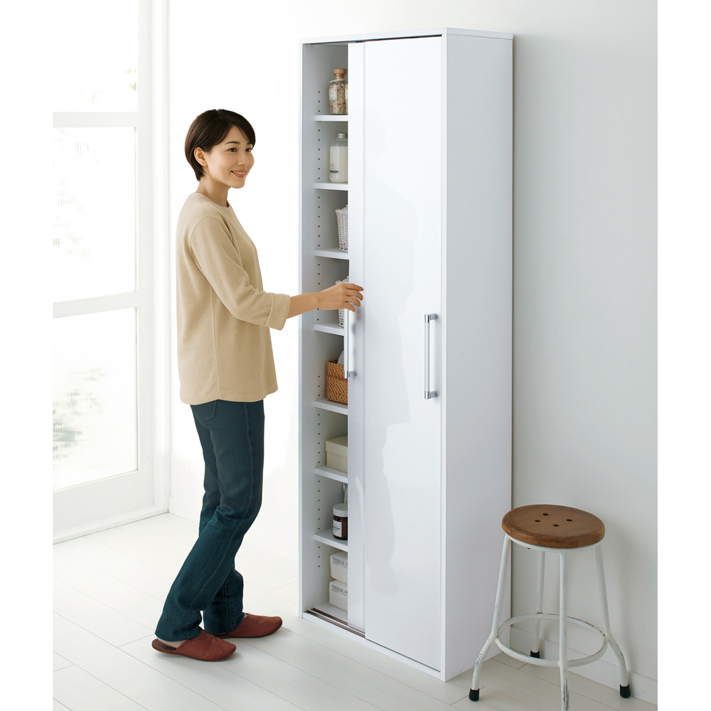 引き戸タイプなので、キッチンダイニングに設置して食器棚やストッカーとしても使用可能。薄型だから、並べて置いても圧迫感がありません。