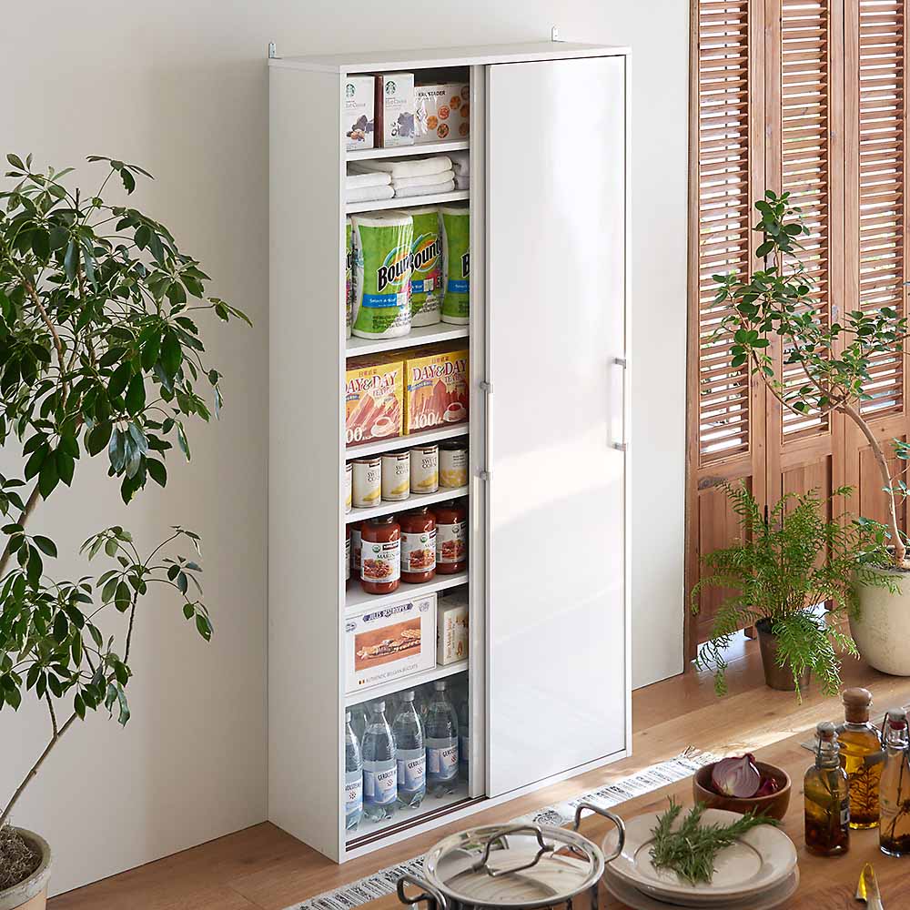 狭いキッチンでも使いやすい引き戸タイプなので、キッチンダイニングに設置して食器棚やストッカーとしても使用可能。薄型だから、並べて置いても圧迫感がありません。