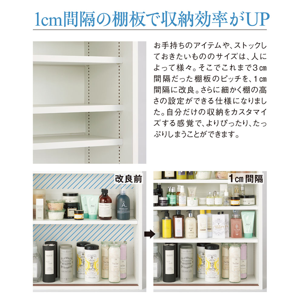 使用例(ホワイト幅75cm・扉を外して撮影)棚板は高さ調節可能1cm間隔で高さ調節が可能な棚板6枚つき(1枚は固定棚)。お手持ちのアイテムに合わせて調節できます。背の高い柔軟剤のボトルや詰め替え用の大きな洗濯洗剤、リネン系や洗面小物まで、様々な高さのものをたっぷり収納。