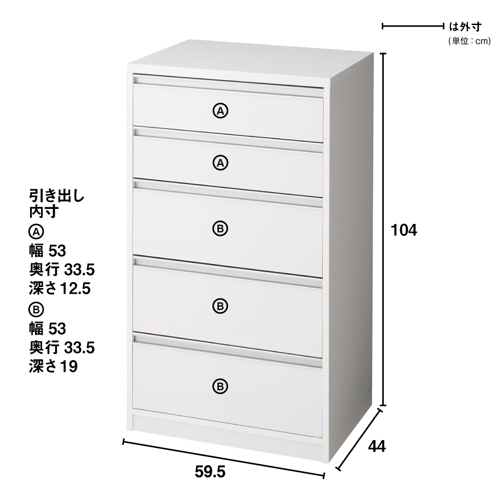 奥行が選べる隠しキャスター付きチェスト クローゼットタイプ 奥行44幅59.5高さ104cm・5段 押入れ クローゼット収納 衣類収納 633332