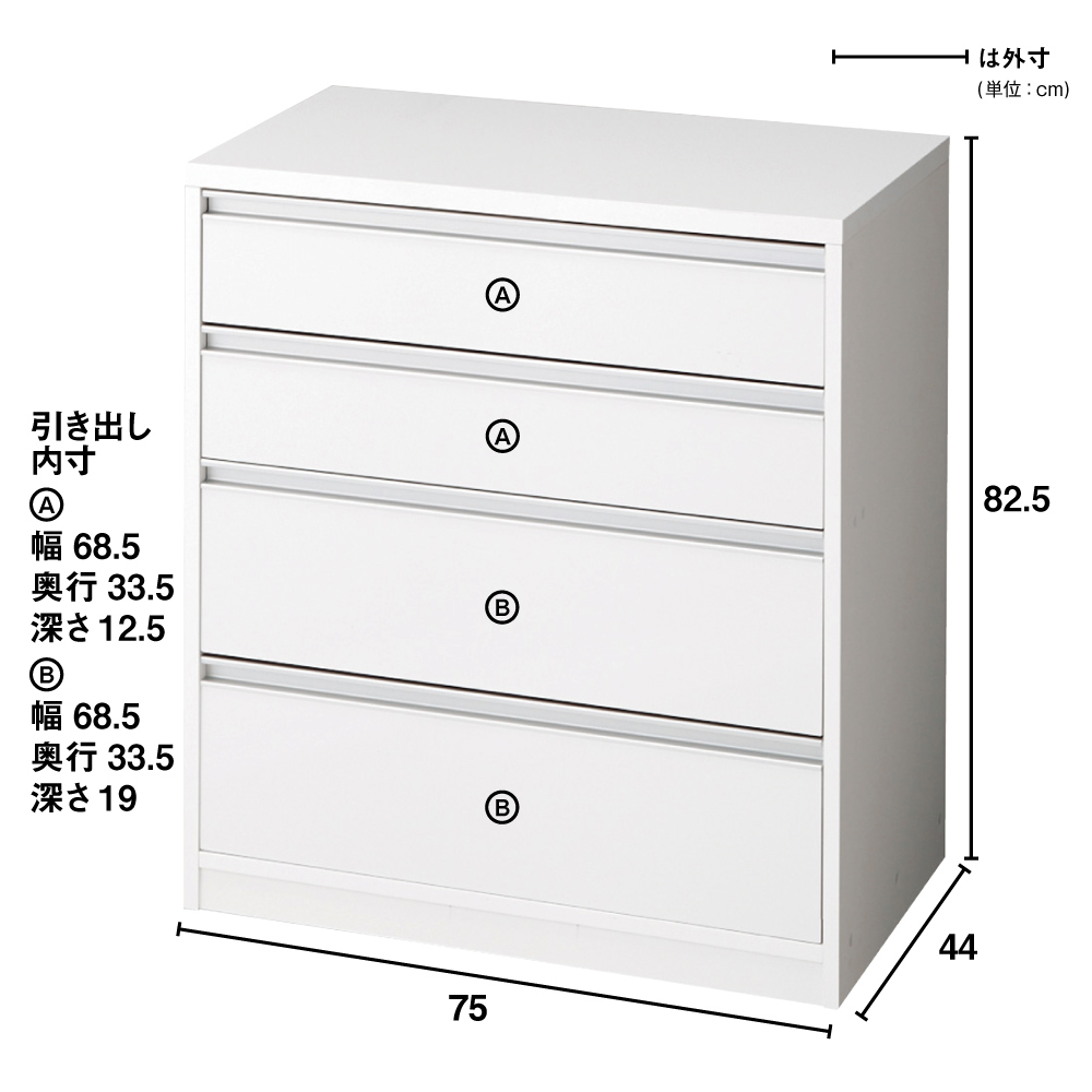 奥行が選べる隠しキャスター付きチェスト クローゼットタイプ 奥行44幅75高さ82.5cm・4段 押入れ クローゼット収納 衣類収納 633334