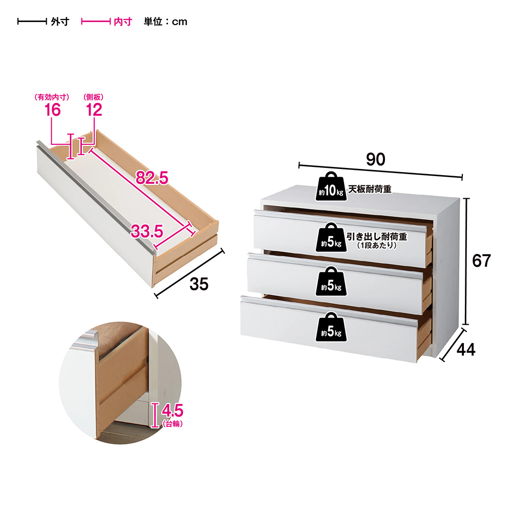 【ローチェスト】気軽に動かせる隠しキャスター付きワイドクローゼットチェスト 幅90cm・3段高さ67cm 押入れ クローゼット収納 衣類収納 590113