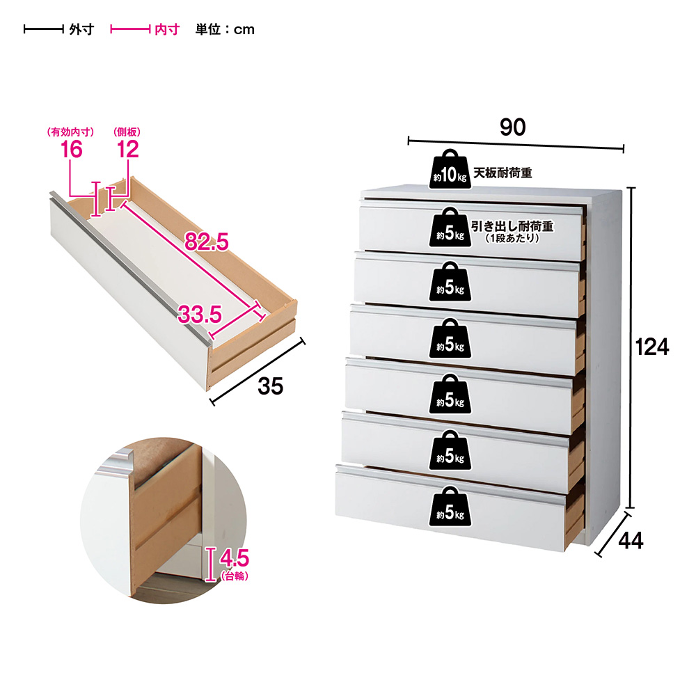 ■引き出し内寸:約幅82.5奥行35高さ17(下から2・4段目16)cm