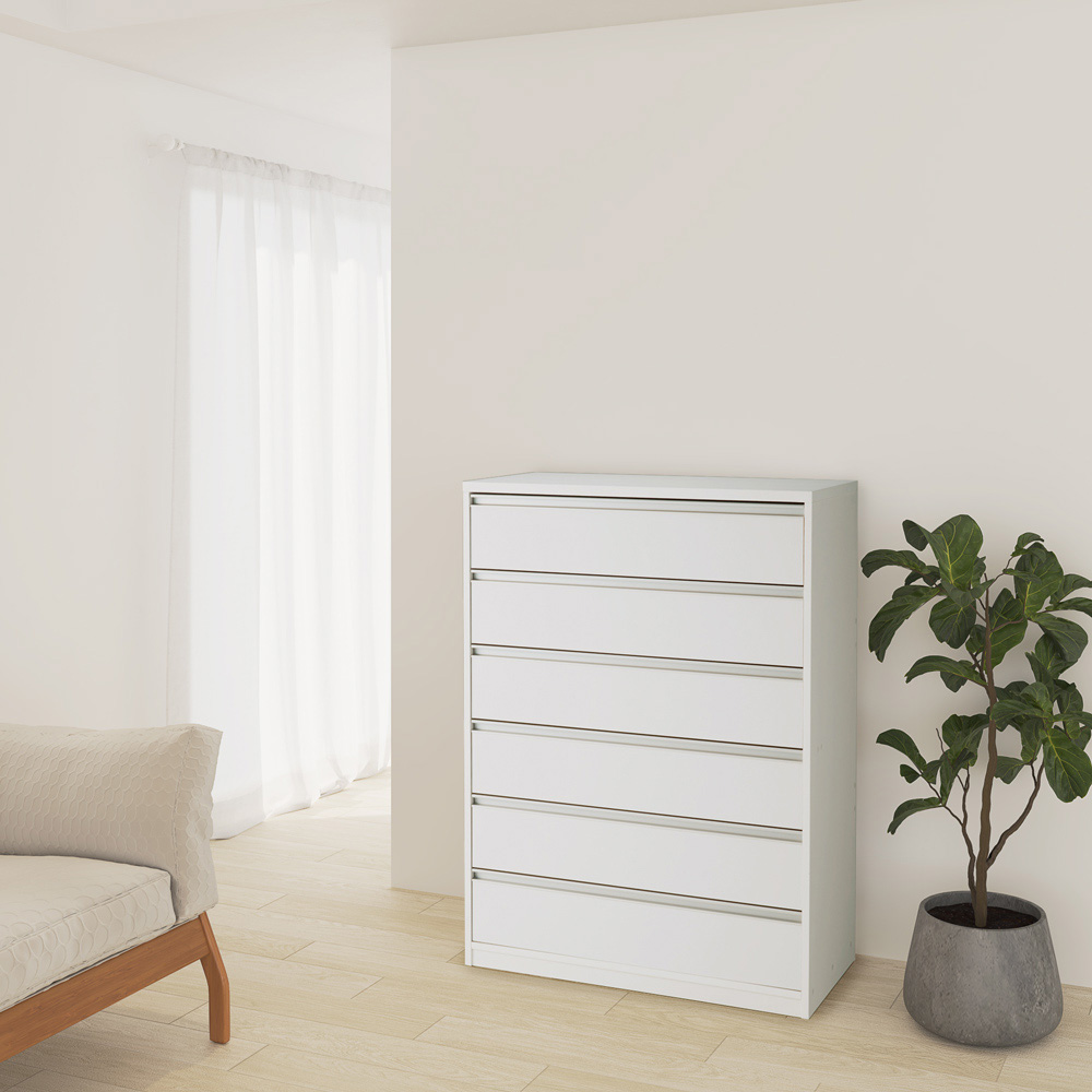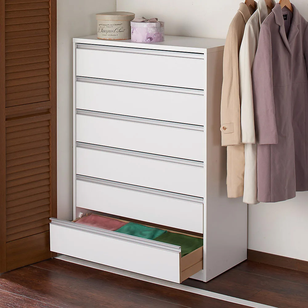 たっぷり収納しても軽く開け閉めできるストッパー付き引出を全段に採用した衣類収納家具(タンス)。隠しキャスター仕様で見た目はすっきり、移動がラクラク。