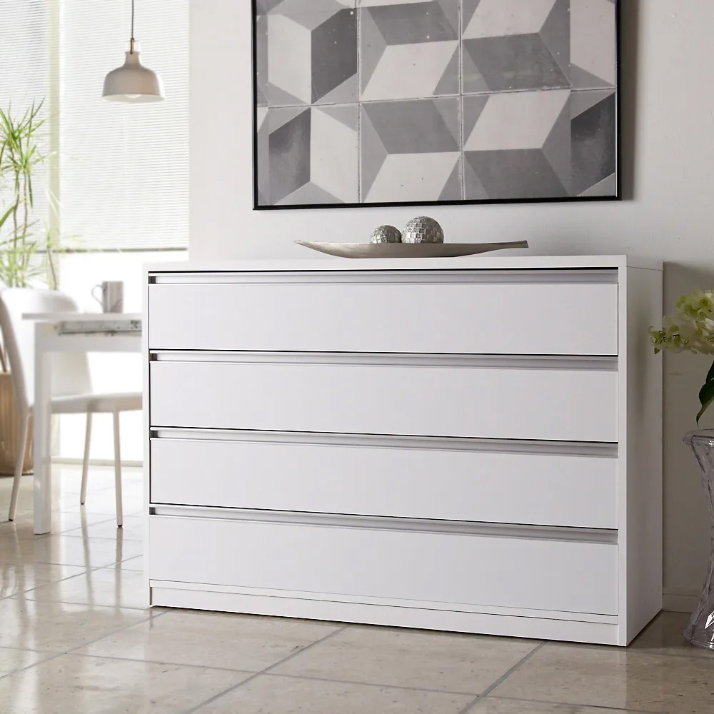 たっぷり収納しても軽く開け閉めできるストッパー付き引出を全段に採用した衣類収納家具(タンス)。隠しキャスター仕様で見た目はすっきり、移動がラクラク。
