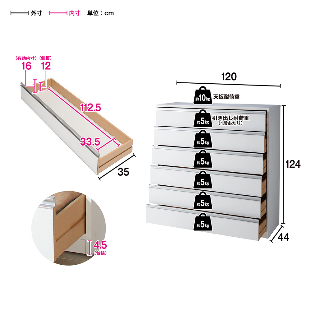 ■引き出し内寸:約幅112.5奥行35高さ17(下から2・4段目16)cm