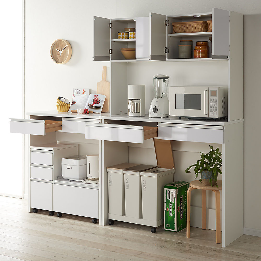 サイズ違いのカウンター、シリーズ商品のキッチンワゴンやチェスト、キッチンボードを組み合わせれば、より使いやすいキッチン収納に。カウンターの幅は90cm・120cm、高さは85cm・100cmから選べます。