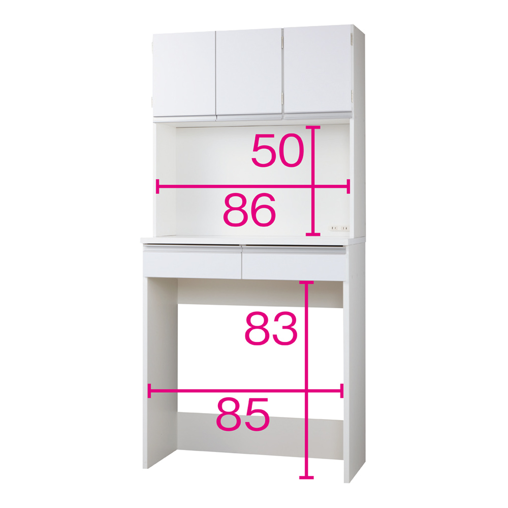 棚・オープン部・引き出しとたっぷり収納して、床置き収納までできるレンジボード。広々とした中天板には大型レンジも設置可能。 2口コンセント(計1500W)付きなので、レンジや炊飯器を使う時に便利です。