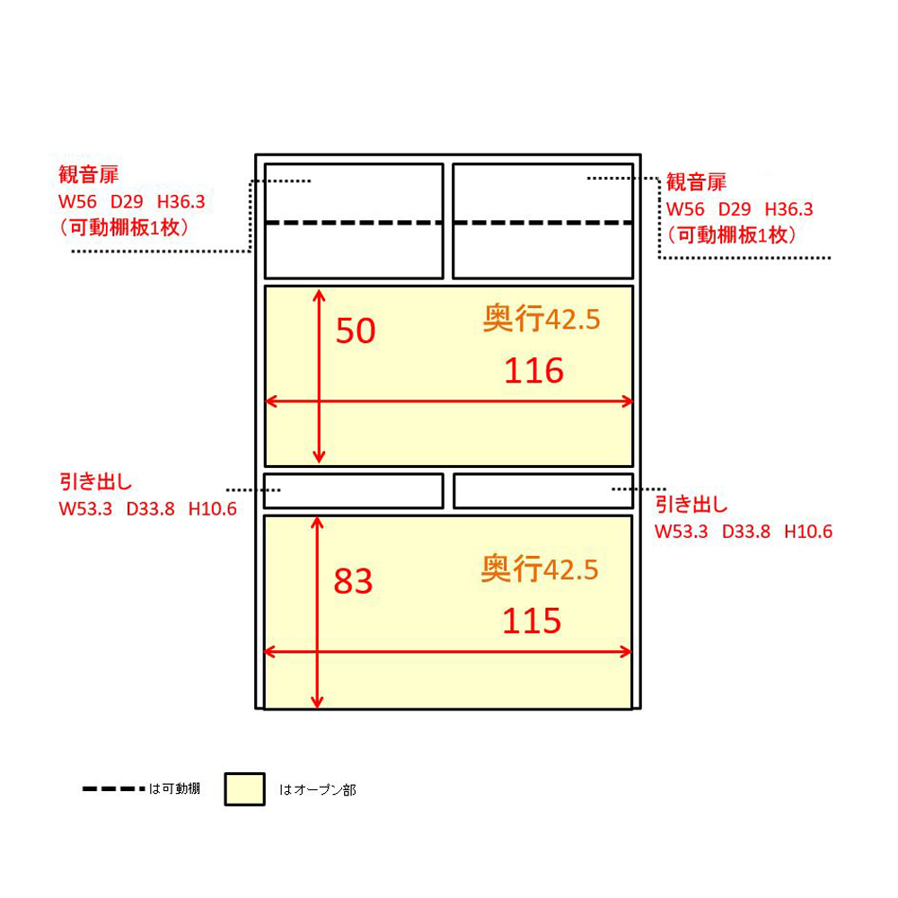 棚・オープン部・引き出しとたっぷり収納して、床置き収納までできるレンジボード。広々とした中天板には大型レンジも設置可能。 2口コンセント(計1500W)付きなので、レンジや炊飯器を使う時に便利です。