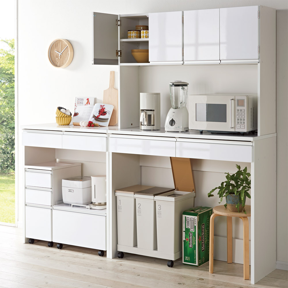 シリーズ商品のキッチンワゴンやチェスト、カウンターを組み合わせれば、より使いやすいキッチン収納に。