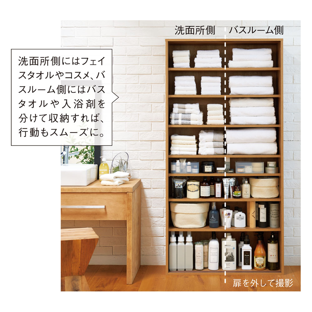 左右片面ずつ隠せるので、衣類とボトルを分けて収納すると見た目がすっきりします。(※写真は幅75cmタイプ。扉を外して撮影しています)