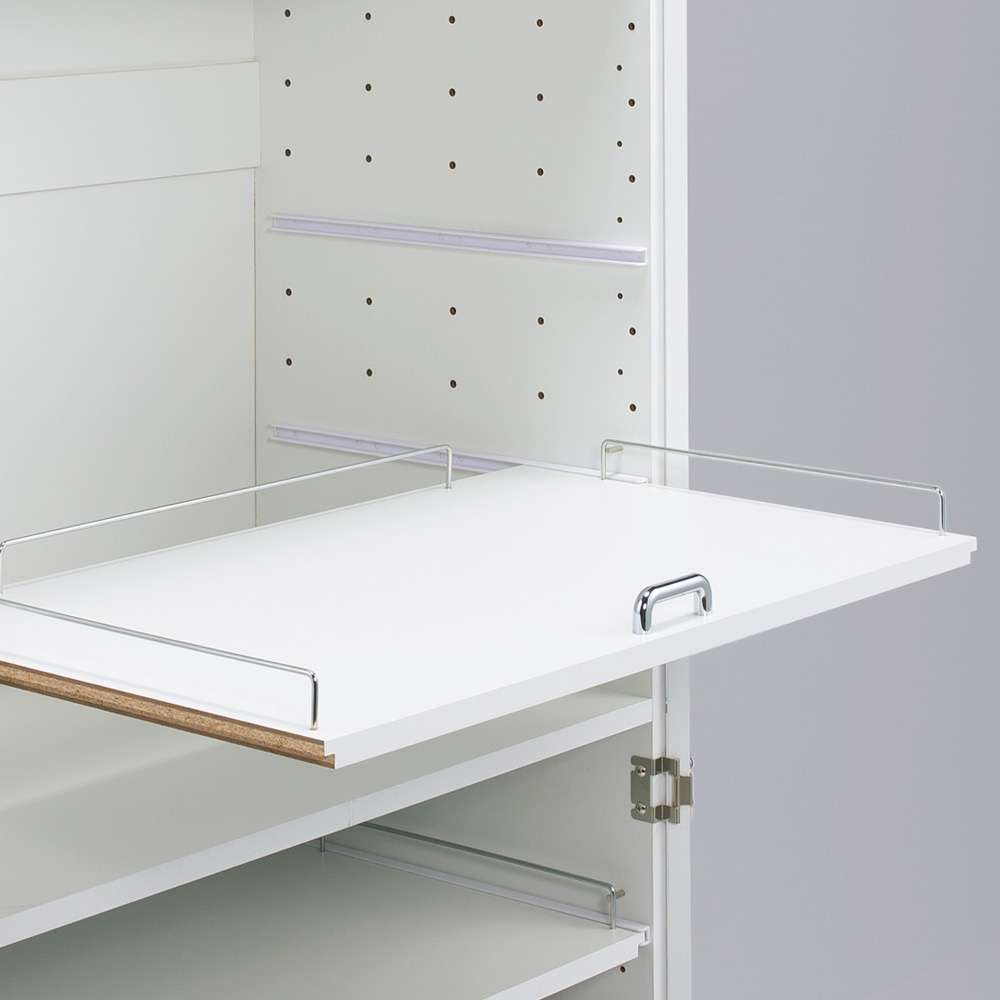 スライド式棚板は、6cm間隔で高さ調整が可能。収納する食器の高さに応じて、お好みの高さに設定してお使いいただけます。また、スライド棚はストッパー付きなので、抜け落ちる心配はありません。