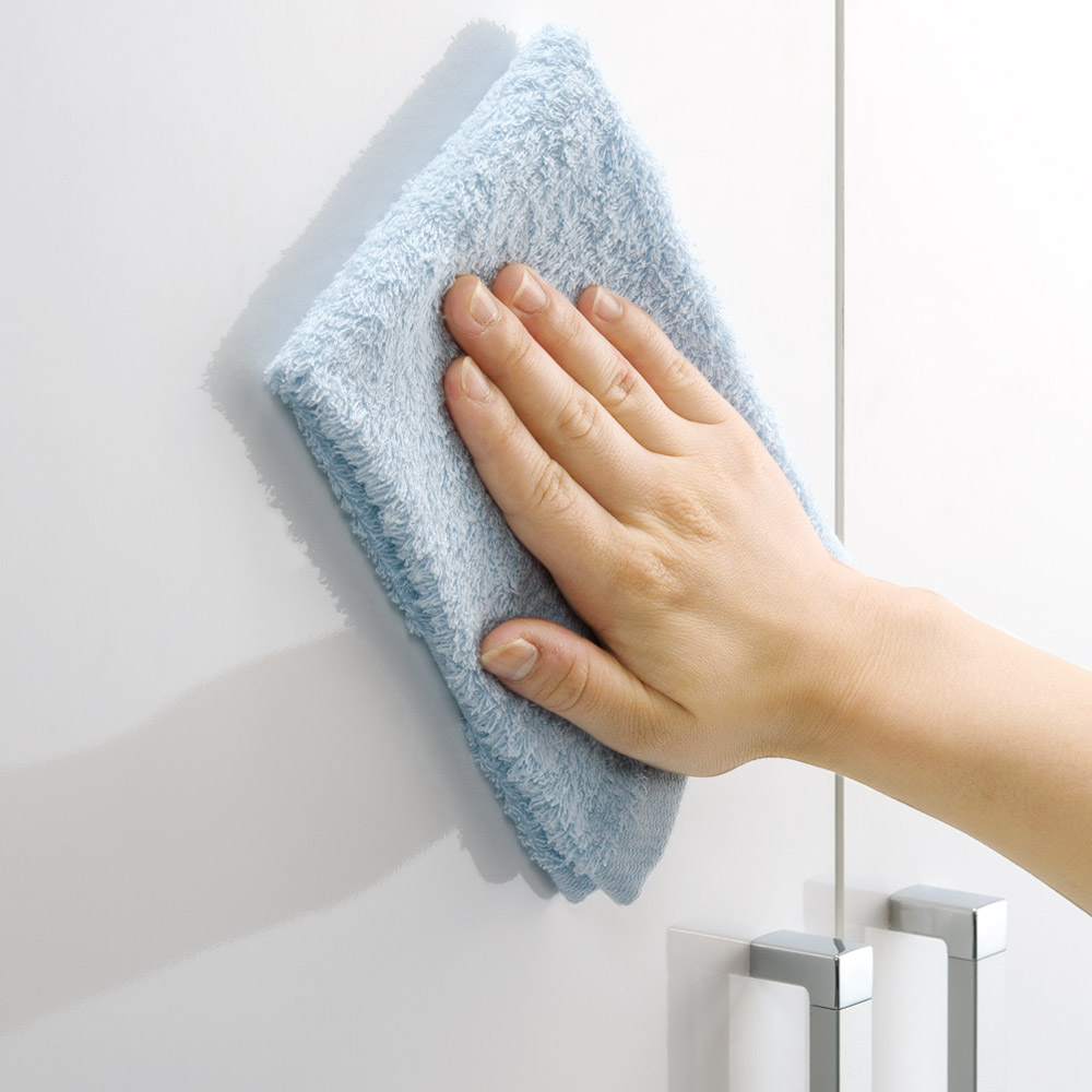 ア:ホワイトはポリエステル化粧合板で、汚れてもお手入れも簡単。