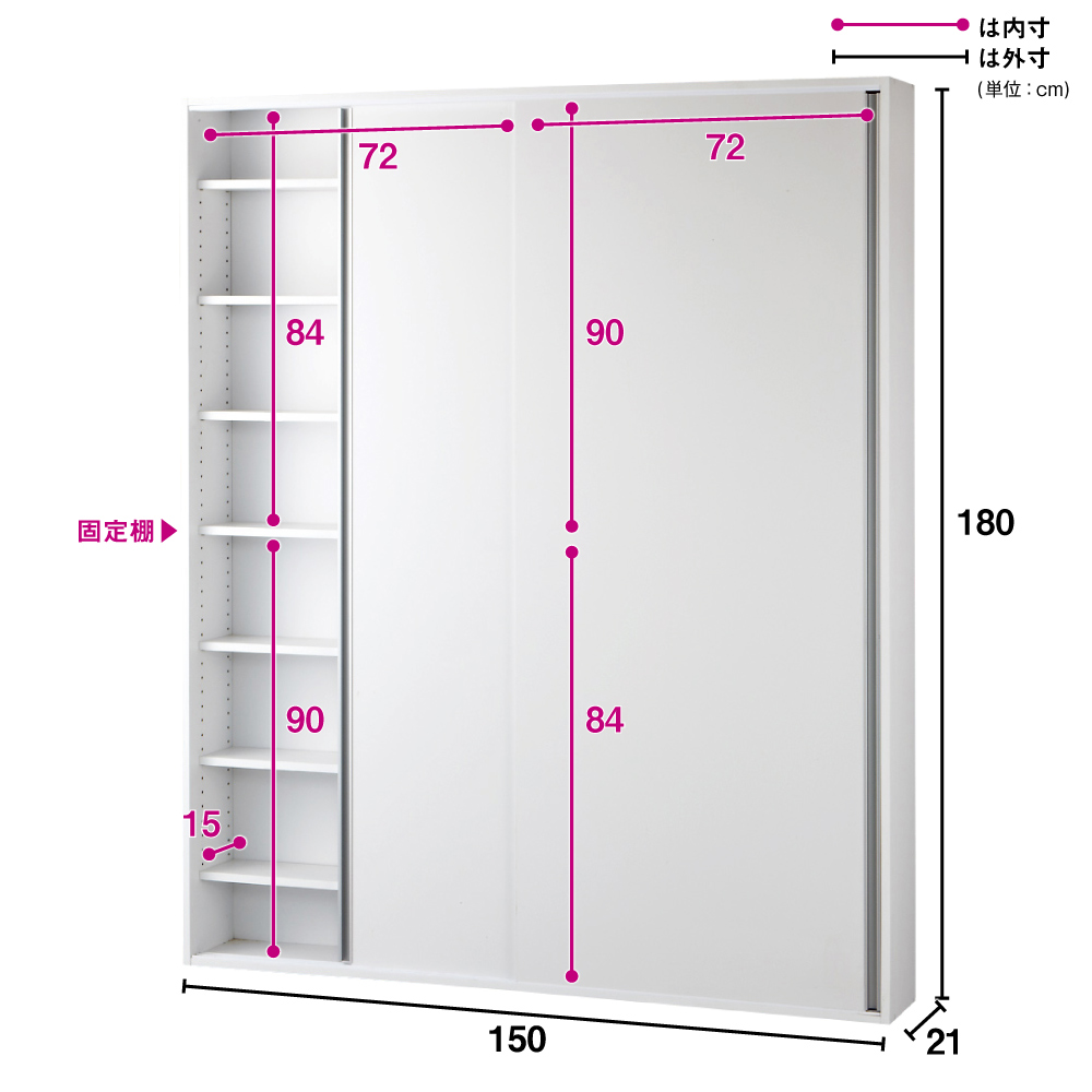 ■サイズ:幅150奥行21高さ180・重さ36kg、上置き設置時の天井対応高さ235~250cm