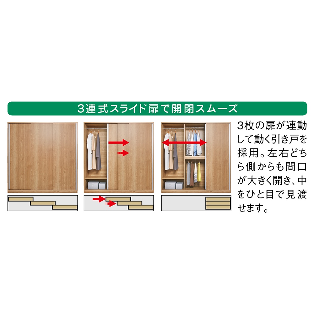 ●扉は引き戸式で開閉スペースがいらないため、ベッド前などでも省スペースにお使いいただけます●扉を3枚に分割しているので、扉が2枚のものよりも開口部が大きいのが使いやすさの秘訣
