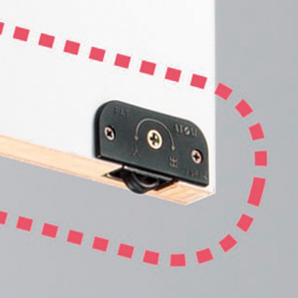 扉のレールにはローラー付きなので、大型の扉でもストレスなく開閉できます。棚板は3cm間隔で位置を調整できるので、収納物に応じて可動出来ます。
