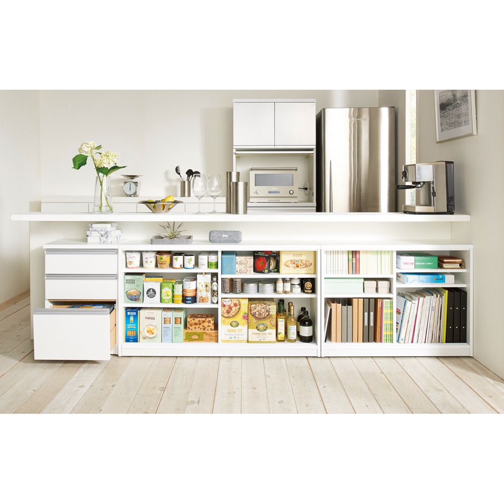 高さ67cm、奥行き30cmの薄型コンパクトな収納庫。カウンター下のデッドスペースを有効活用にぴったり。キッチンやリビングの小物からストック品まで、まとめて大量収納できます。