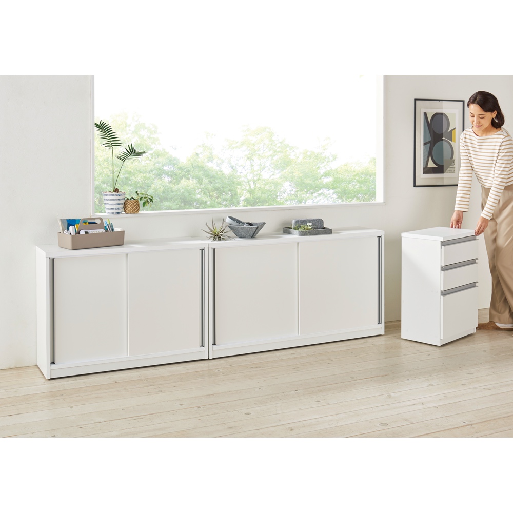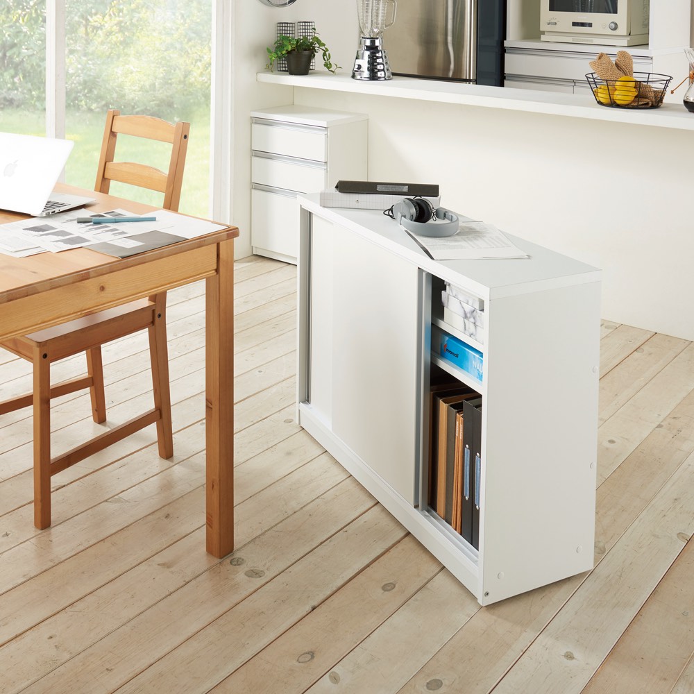 リビングでは窓下収納、FAX台や電話台、ローボードとしてもお使いいただけます。他にもキャスターを生かしてサイドテーブルとして使用するなど、幅広く活躍します。