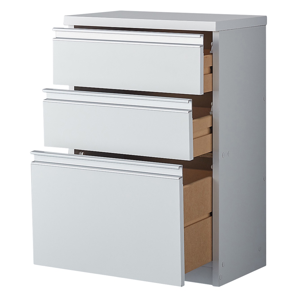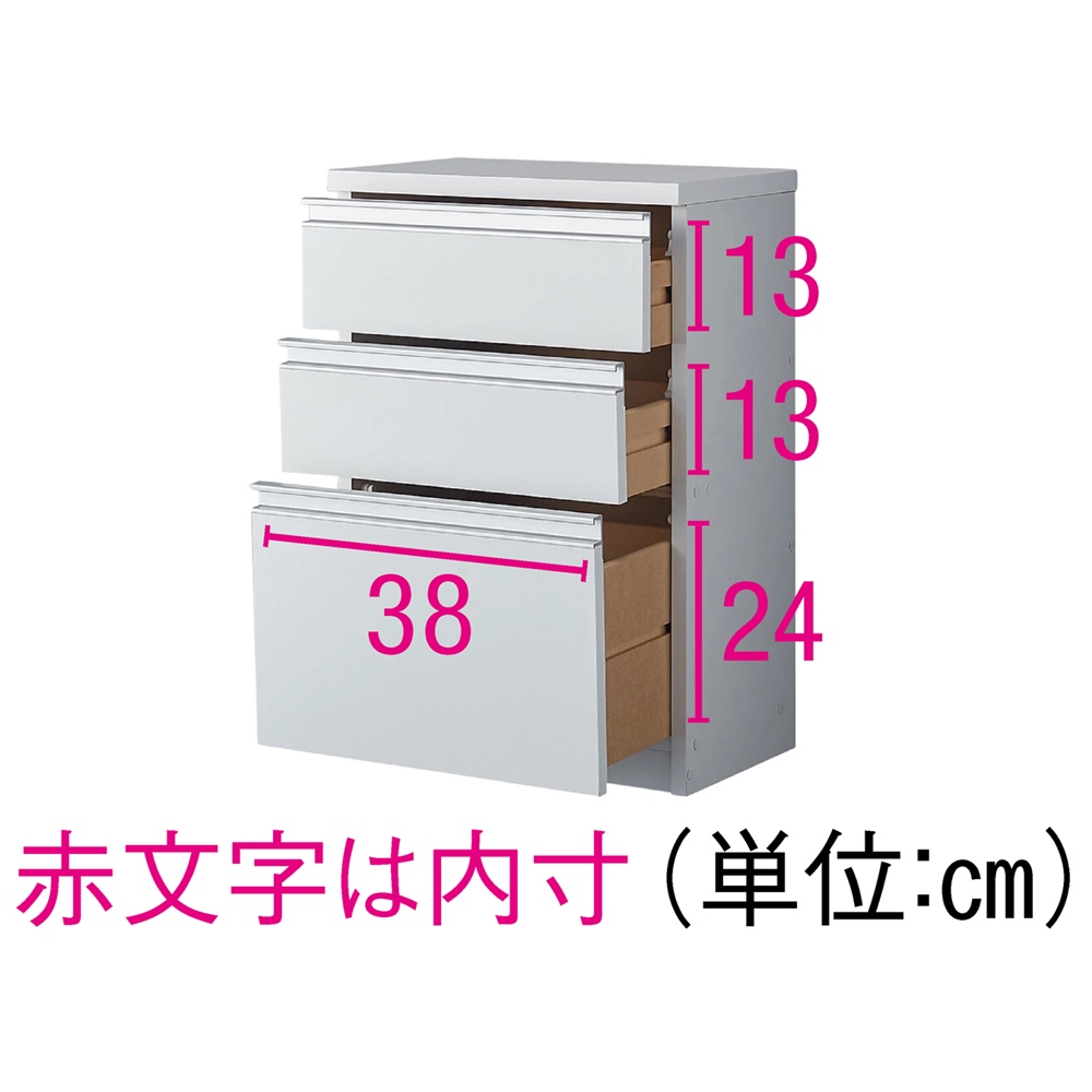 引き出しは3段あるので、文房具やメガネなどの小物から、厚みのある本やファイルまで様々なものを収納できます。