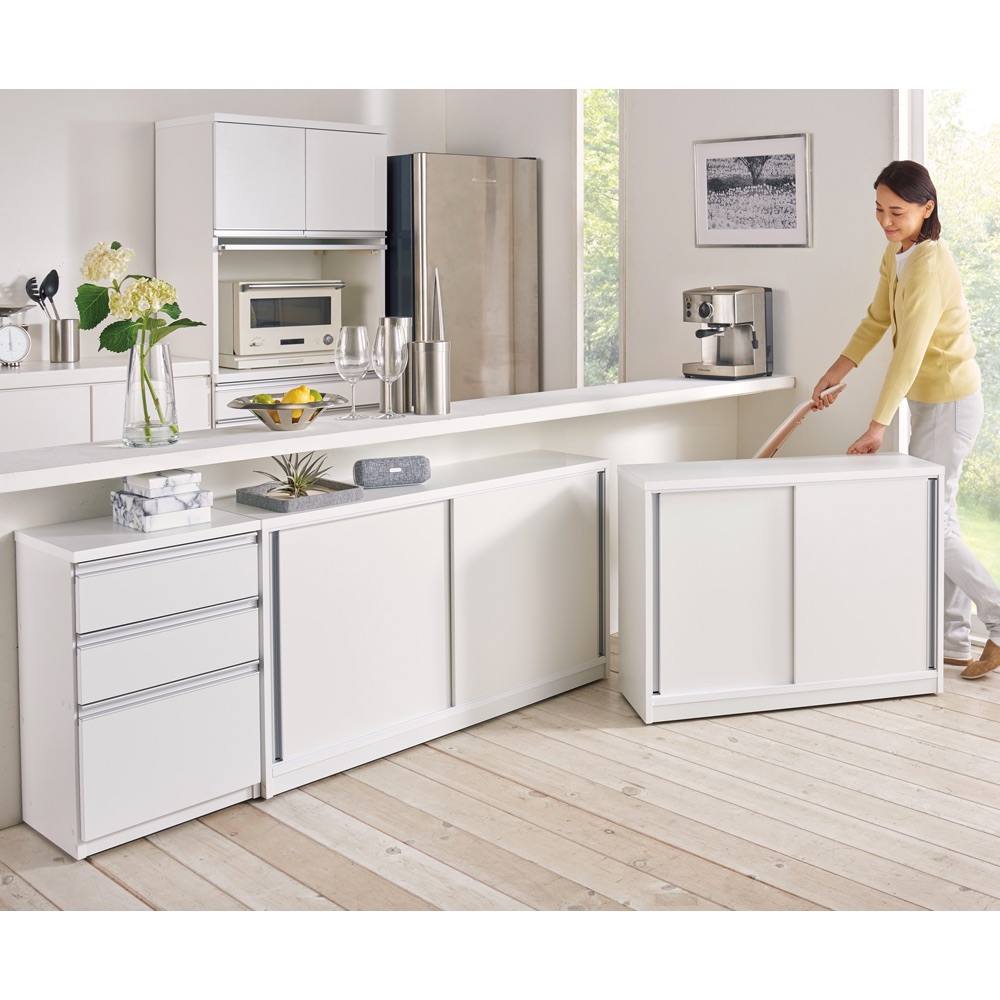 隠しキャスターが付いて動かしやすい、引き出しタイプのカウンター下収納庫。掃除や模様替えもスムーズにできます。引き戸式(幅90cm/120cm)、引き出し式(幅45cm)の2タイプ。※お届け商品は引き出しです。