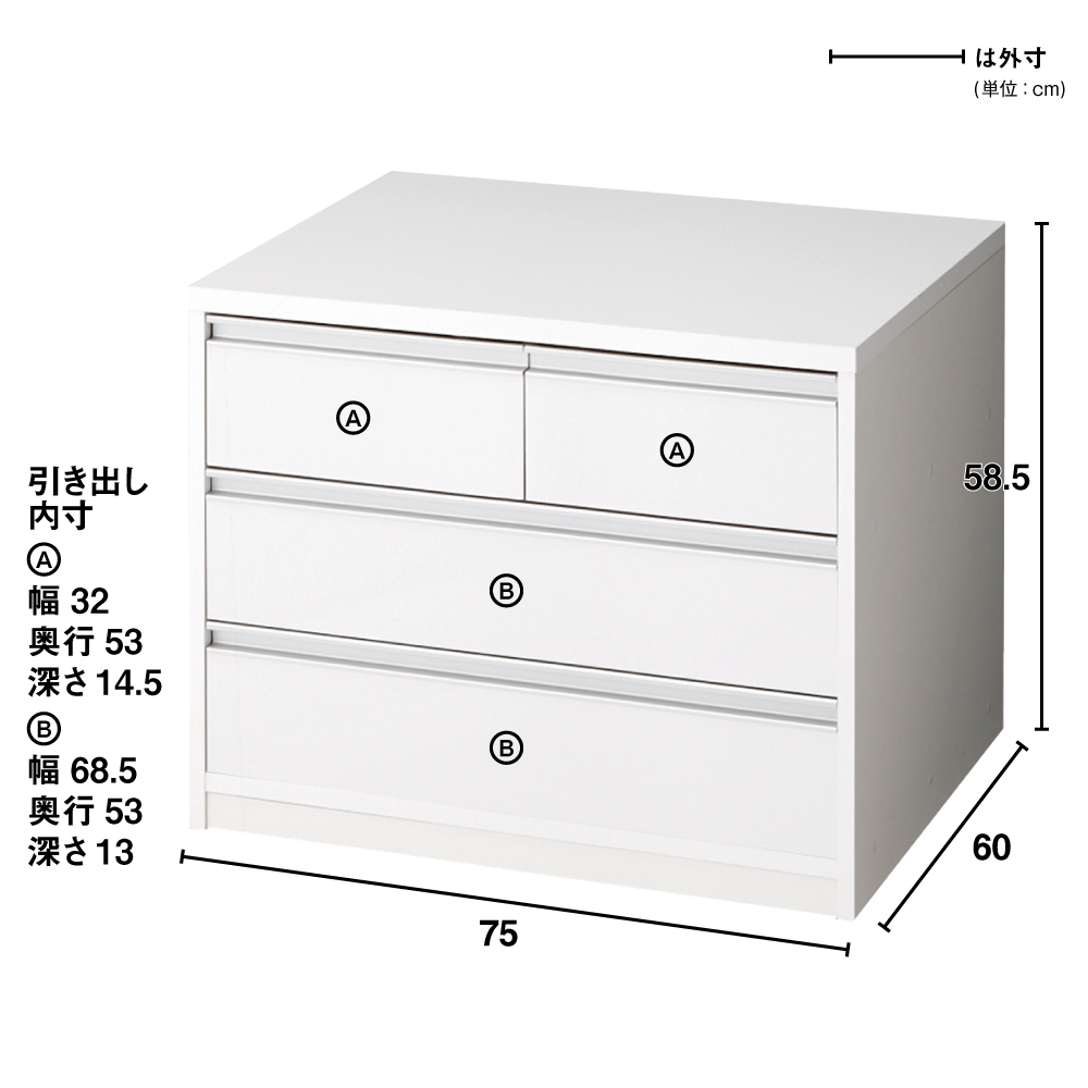 ■サイズ:幅75奥行60高さ58.5cm、重量約27kg、引き出し内寸…(小)幅32奥行53高さ14.5cm、(大)幅68.5奥行53高さ13cm