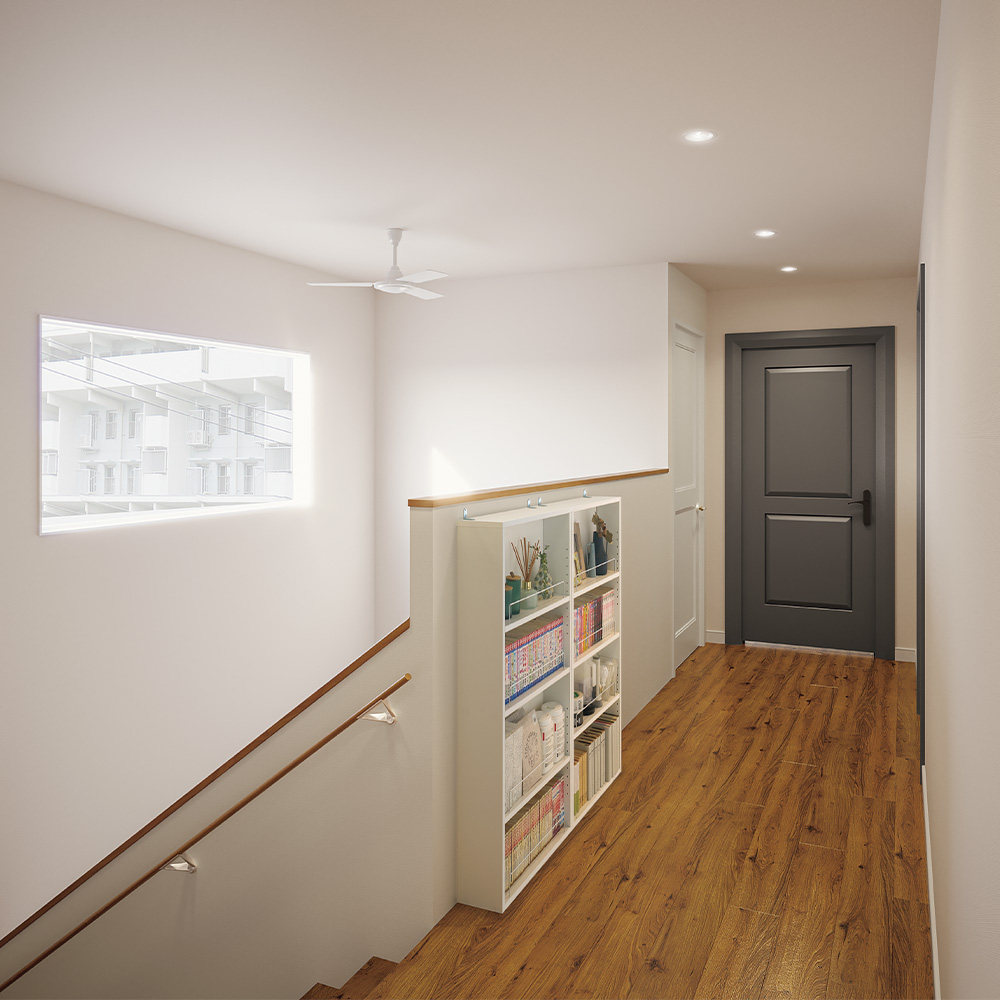 使用イメージ 真ん中で分割して、2階の狭い廊下に横並びにも設置できます。取りやすい位置に懐中電灯などを置いておくと、停電時などにも便利です。 ※写真は別売りの幅60cmタイプです。