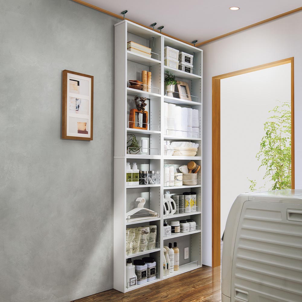 ●棚板の奥行をフルに活かせるよう、あえて背板を付けない設計で収納効率をアップ。●背板がないので、壁にスイッチや配電盤、コンセントなどがある場所にも設置できます。