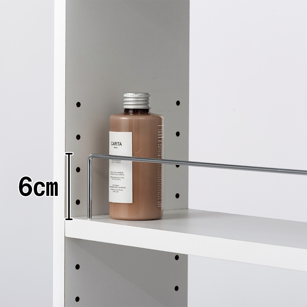 背面の板がないため、薄型でも奥行を最大限活かせます。細かな物が落ちにくいこぼれ止め(落下防止バー)付きで、バーを外して奥行15cmをフル活用する使い方もできます。