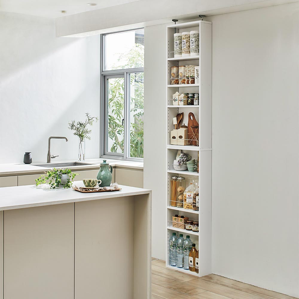 ●ドア横や廊下、洗面台の後ろの壁面など、これまで家具が置けなかった場所にわずかな奥行を利用して設置できるラックです。●扉がないので開閉のスペースをとらず、狭い場所に置いても生活動線を妨げません。