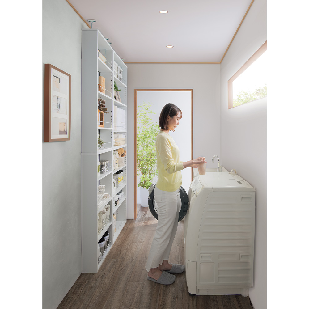●ランドリールームの入り口横や洗面台の後ろに置いて、タオルや美容家電、洗剤のストックなどを収納。●キッチンでスパイスや食品ストック、水のボトルなどを。薄型で見やすく、賞味期限切れも防げます。