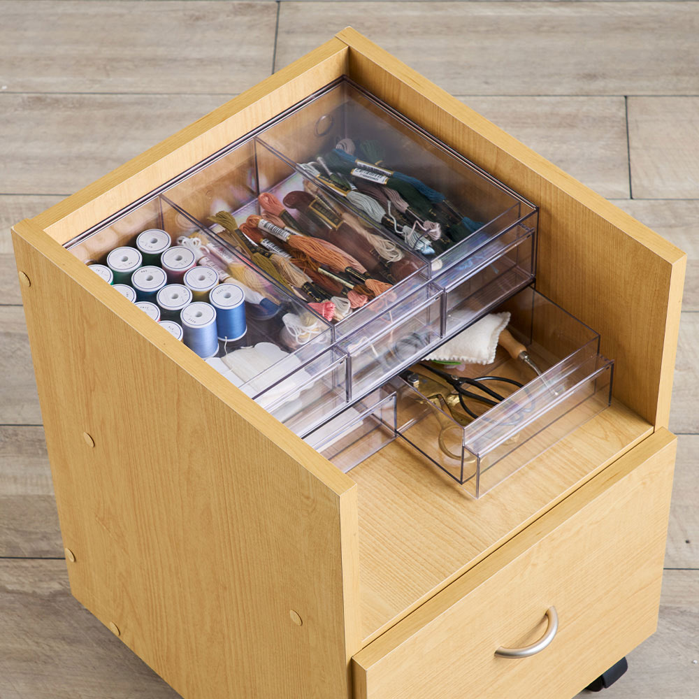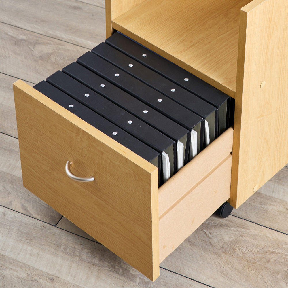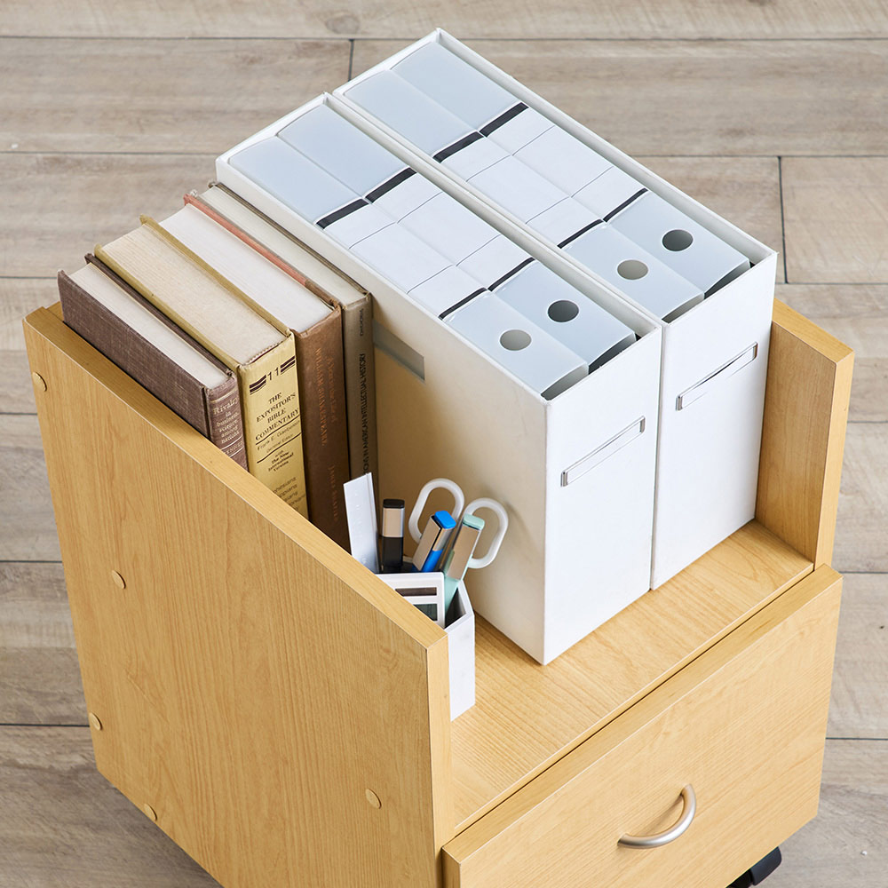 ワゴンの上部は、一時置きにも重宝するフリースペース。持ち帰った仕事バッグや趣味の道具箱、作業中のファイルボックスなどが自由に置けて、とても便利。下段の引き出しはA4サイズのファイルにも対応し、座ったまま必要なものに手が届くから、作業効率がグンとよくなります。コンパクトサイズでも、作業スペースや収納はしっかり確保
