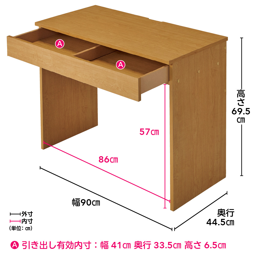 (イ)ミディアムブラウン 天板サイズは幅90cm奥行44.5cm。ちょっとした作業には十分の広さ。