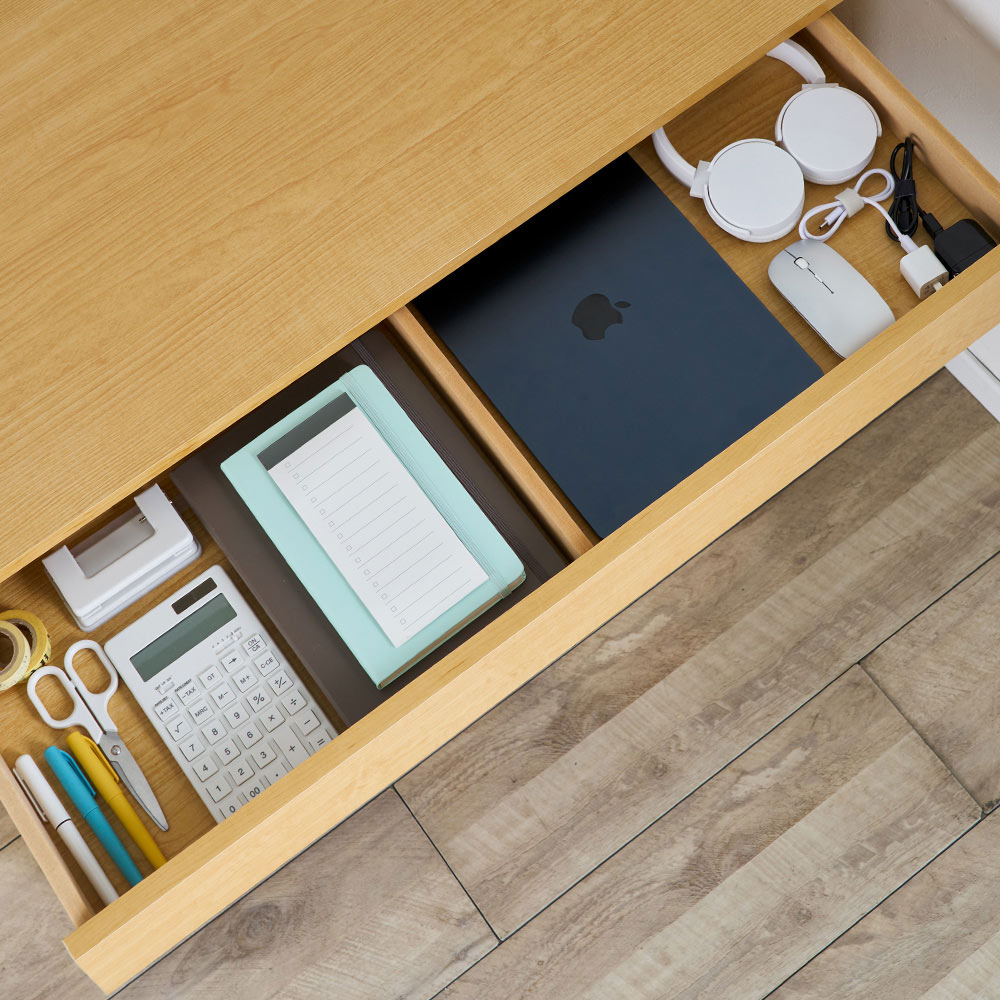 デスクは書類や小物がしまえる引き出し付き。生活感を隠せて、ホコリも防ぎます。