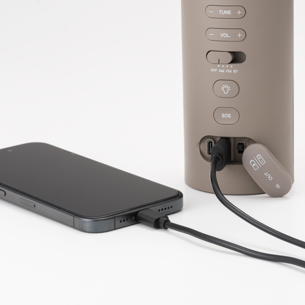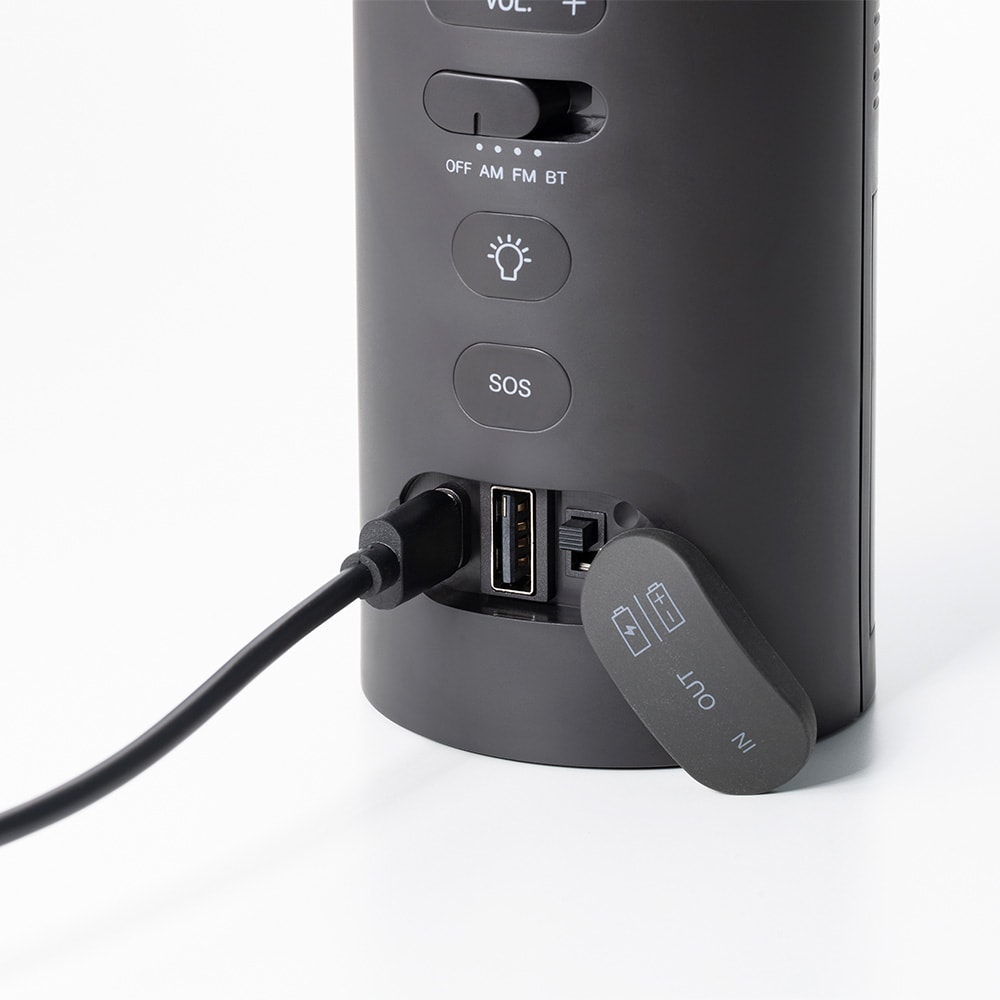いざという時の連絡手段としてスマホは必須。だからこそ、安心してスマホの充電ができる機能も搭載。スマホにUSBケーブル Type-Cで接続すると、連続待受時間約8時間、連続通話時間約18分が可能です。(本体を150回/分で約7分間手回し充電した場合、または乾電池からの充電の場合)