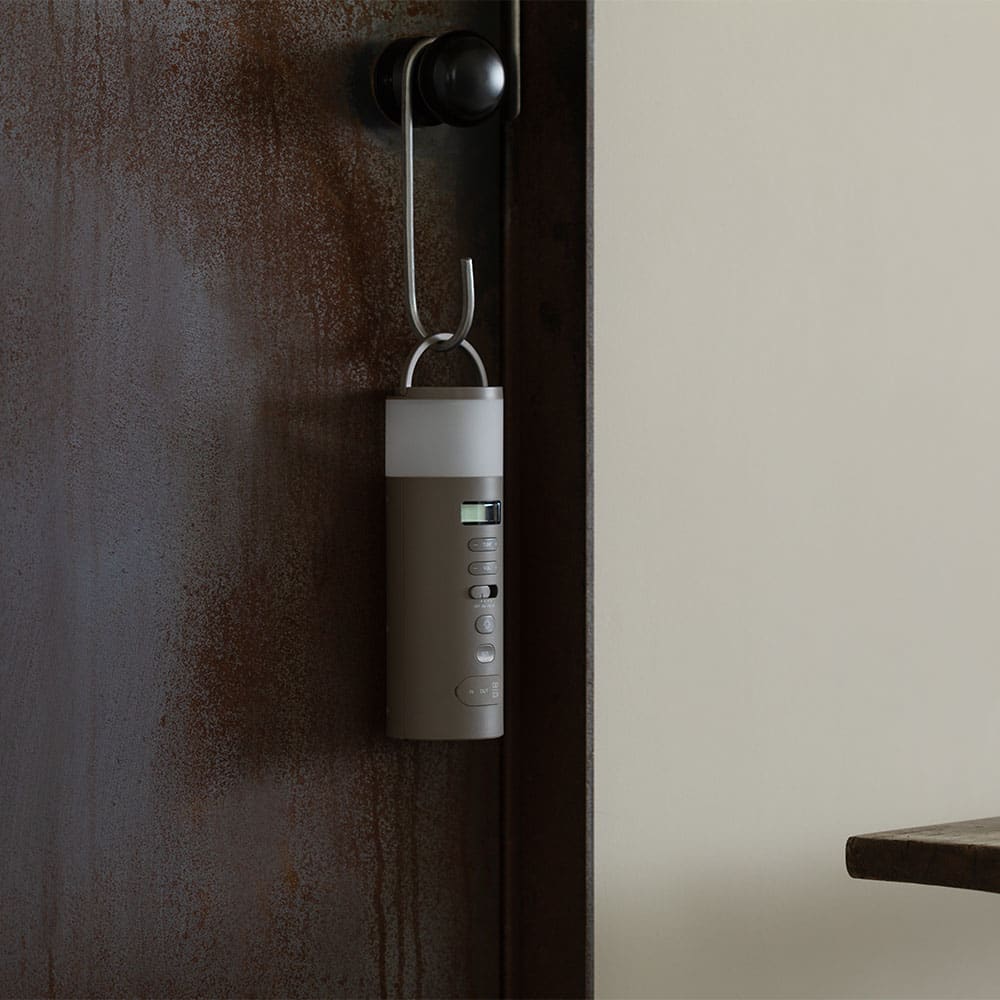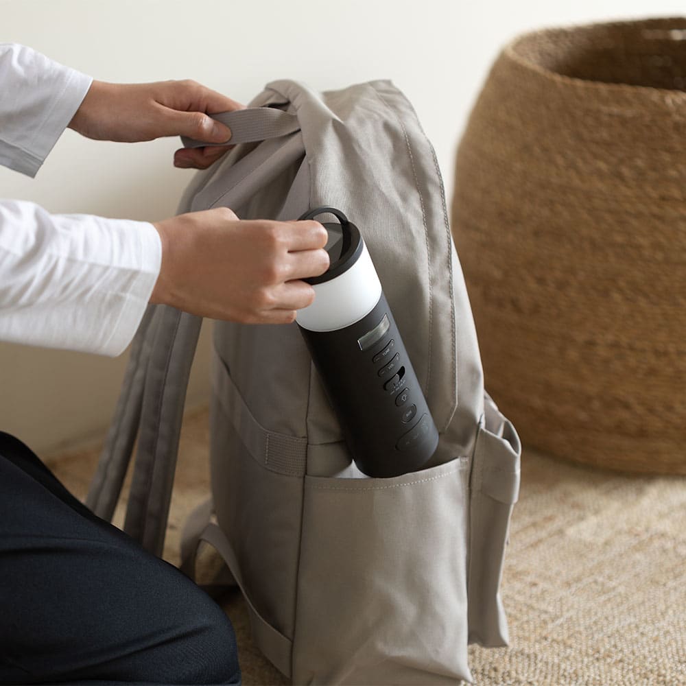 余計な凹凸のないすっきりとした筒状のフォルムなので、リュックのサイドポケットなど、わずかなスペースに収納できます。天面には取っ手付きで、緊急時にもスッと持ち出せて安心。