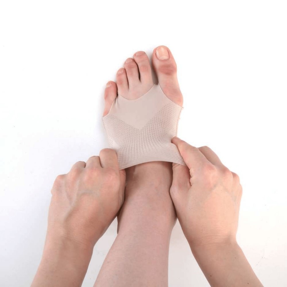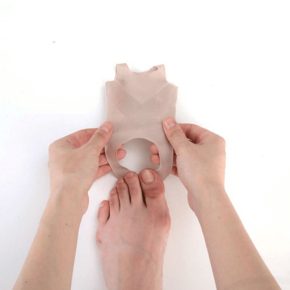踵に引っ掛けるタイプでズレにくく、歩いても走ってもピタッとフィット。極薄の素材をクロス使いして高フィットに!自然に指先を強化し、外反ケアも! 着用例