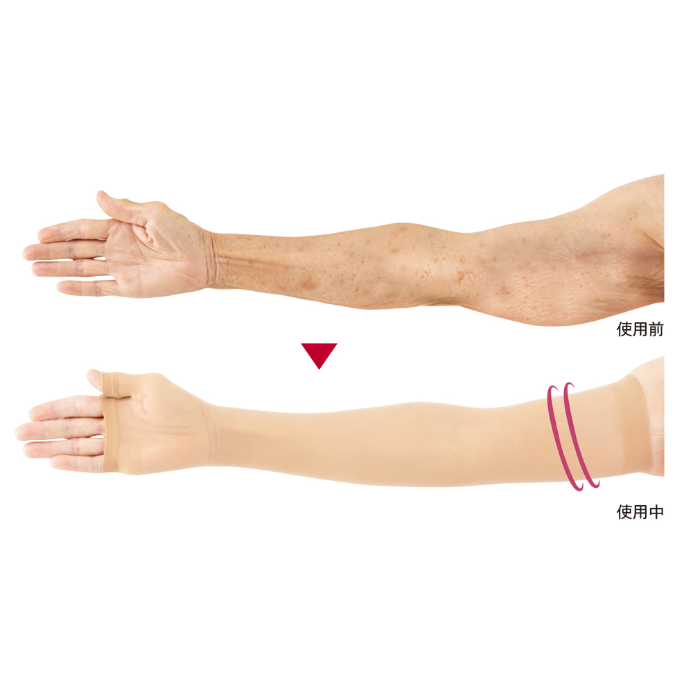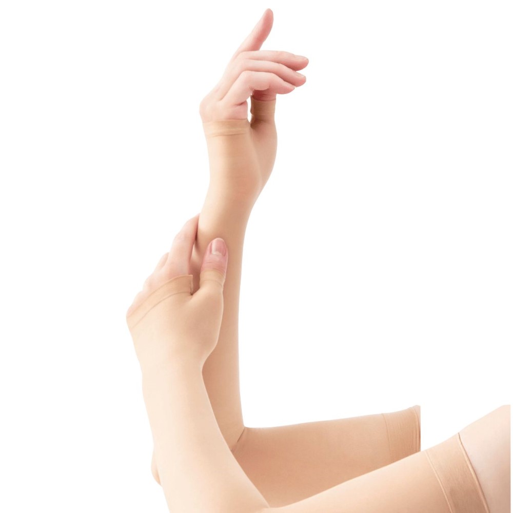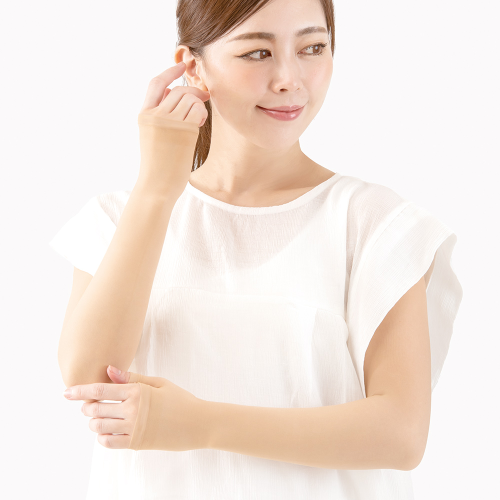 腕は意外と見られているもの。このアームカバーはストッキングのように肌にぴったりフィットして、シミやシワ、血管などを自然にカバー。素肌感のあるワントーン明るい肌を演出しながら日差しもカバーしてくれます。この夏は自信を持って腕を出しましょう!