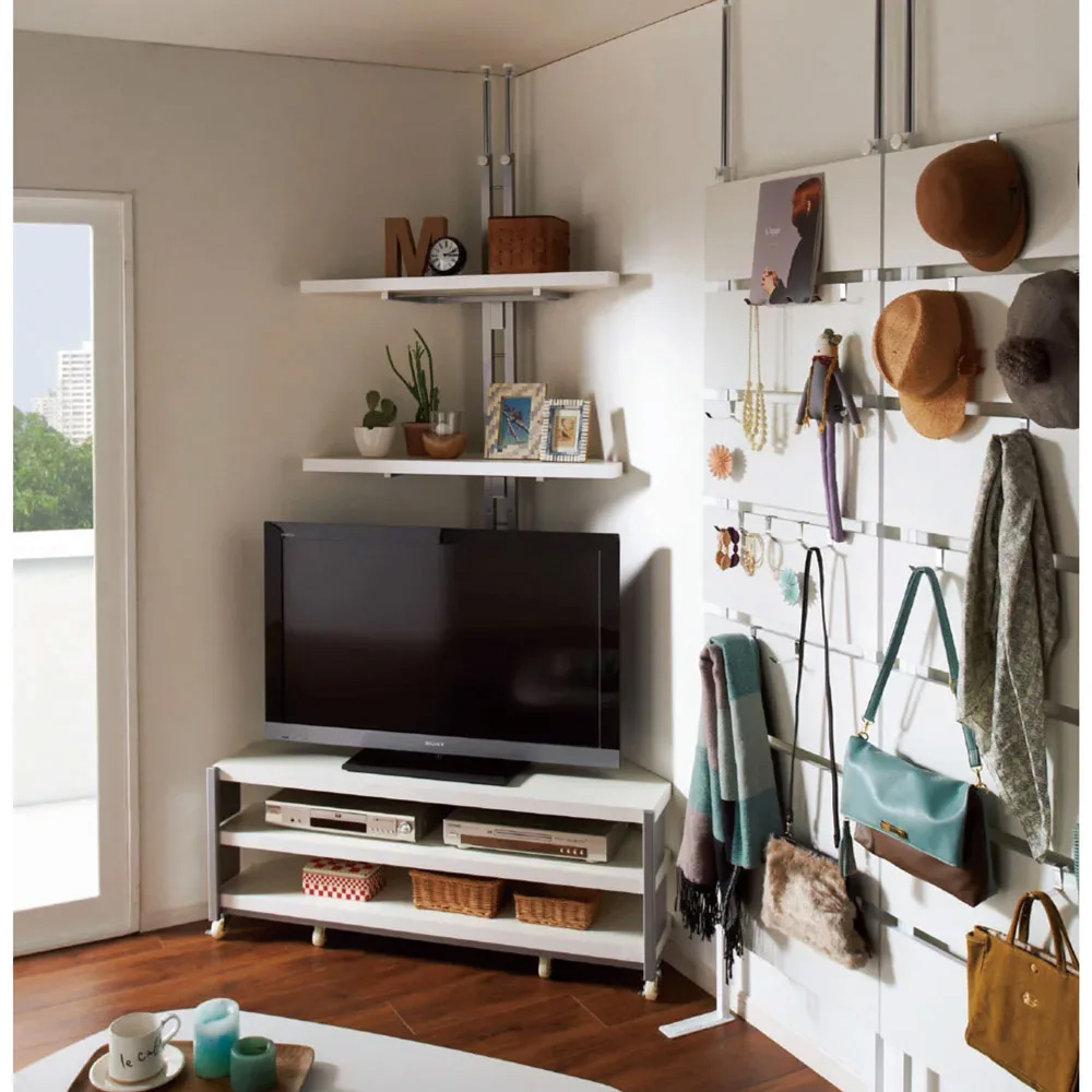 ●テレビが薄型・大型になってもお部屋のコーナーにテレビを置かれる方は多く、コーナーテレビボードは今でも大変人気です。●このシリーズは、別売りの『突っ張り式スペースラック』を合わせてご使用いただくことで、