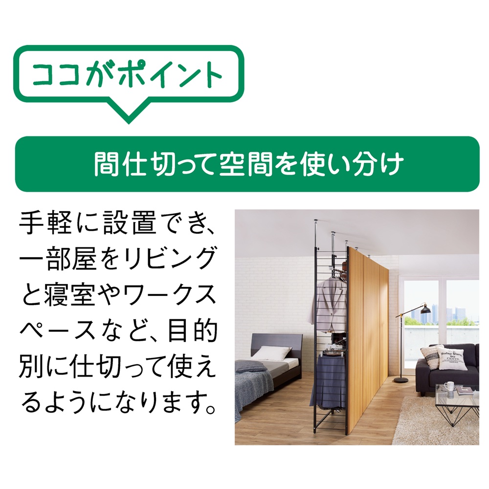 ●広めのお部屋に置いたベッドスペースの目隠しとして。●増加傾向のテレワークをするための、ホームオフィス空間の間仕切りとして。