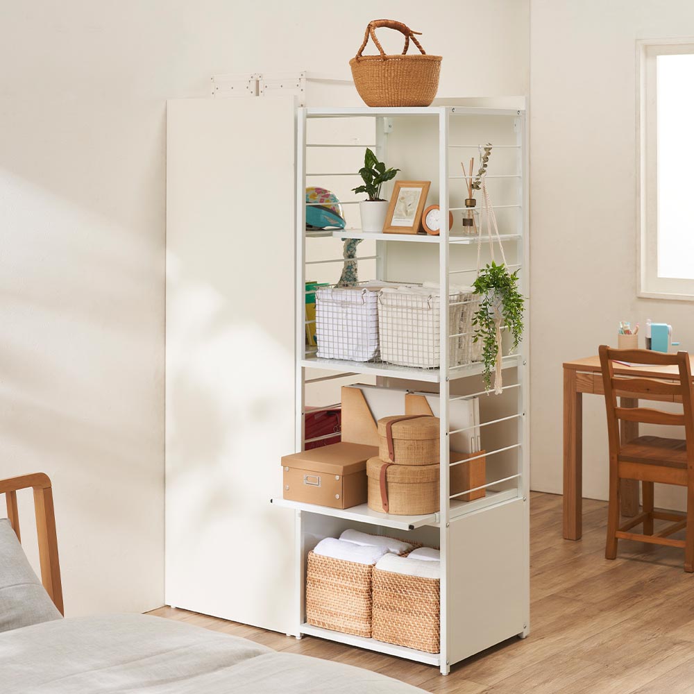 コーディネート例(ア)ホワイト 置くだけで手軽に生活空間を間仕切ることができる収納ラック。キッチン以外でも限られた空間を自由に機能的に活用できます。 ※写真左から棚タイプ、ワゴンタイプ。