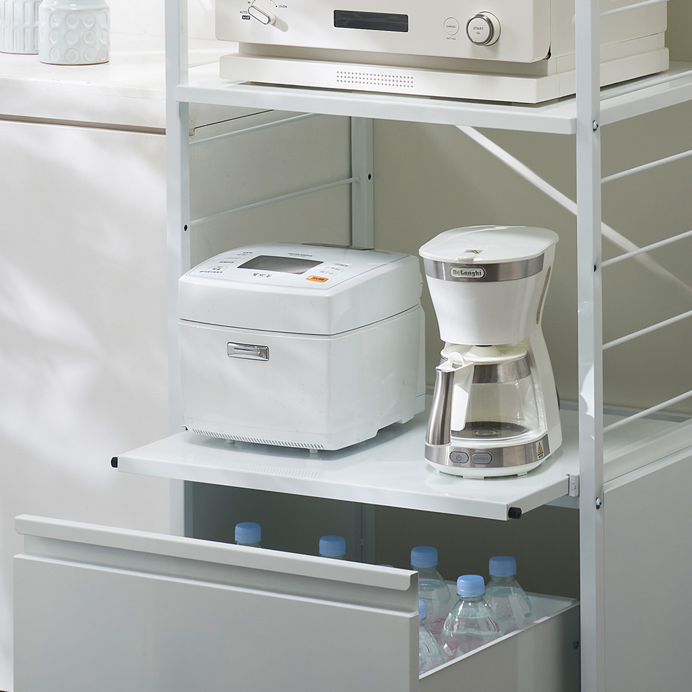 炊飯器やポット・電気ケトルなどの蒸気を逃がせる便利なスライド棚付き。奥のものまで取り出しやすくスムーズに引き出せます。