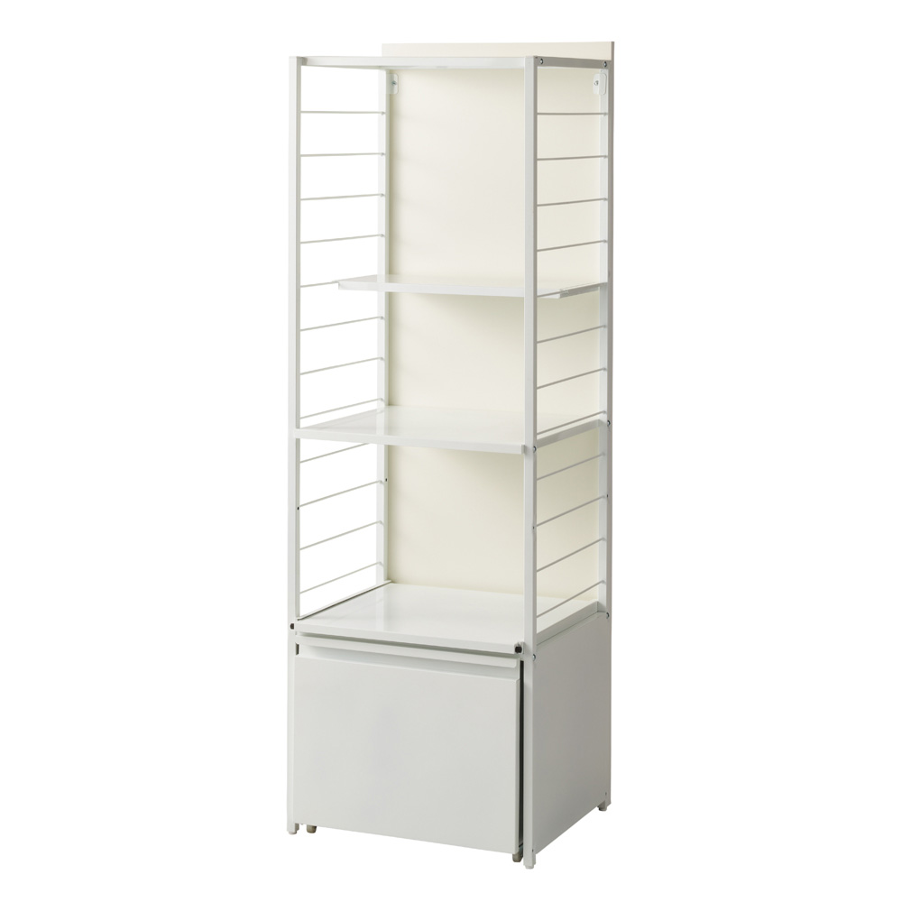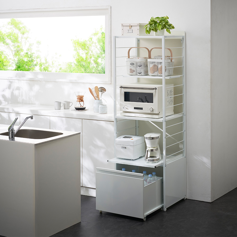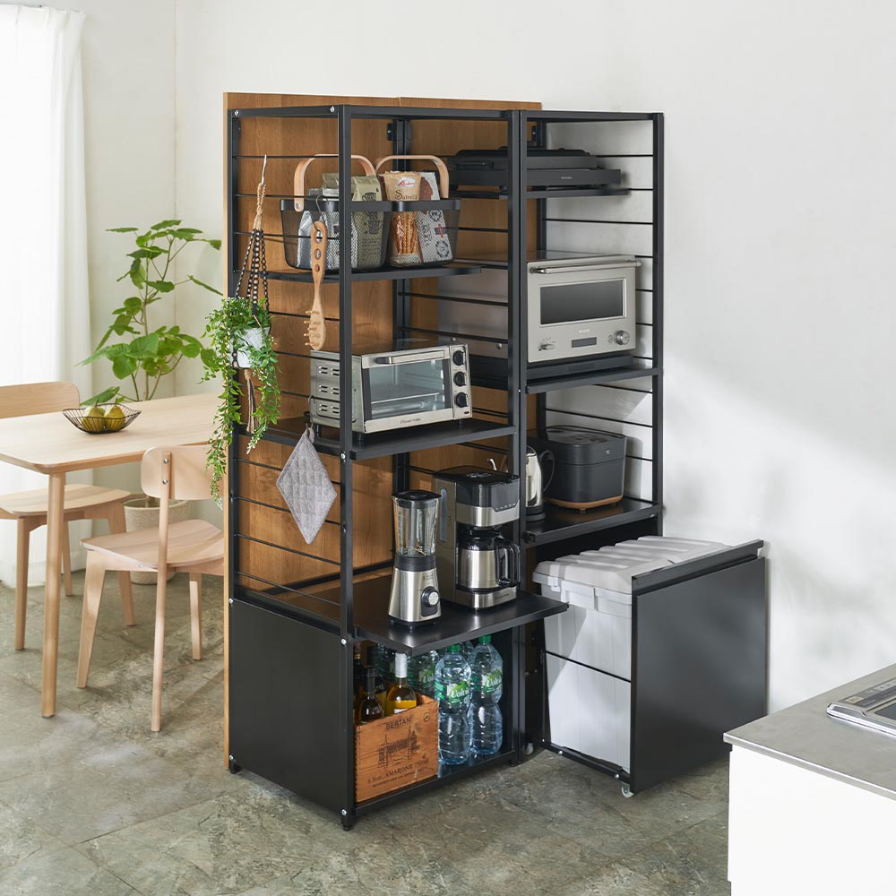 ワゴンタイプ、ゴミ箱タイプ、棚タイプを選んで、調理家電や食品ストックなどを効率的に収納できる頑丈ラック。背面パネル付きなので、間仕切りとしても活用できます。