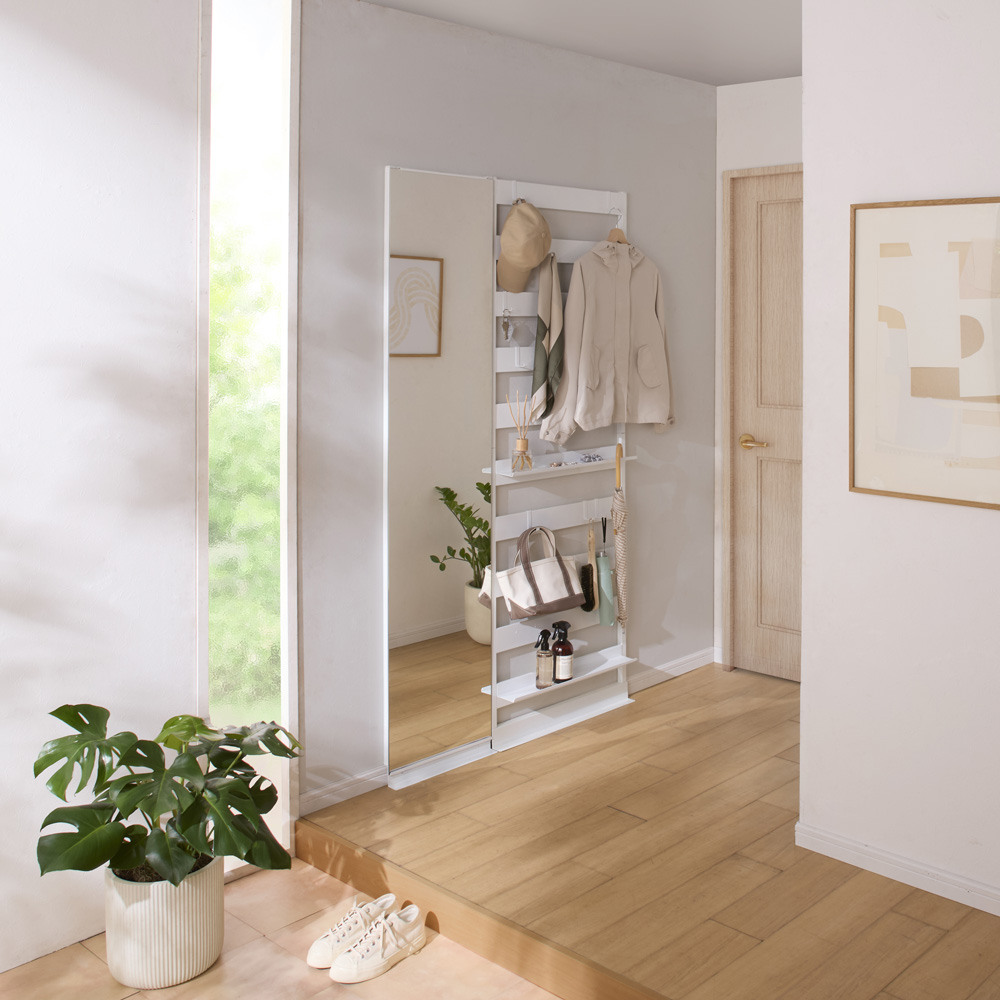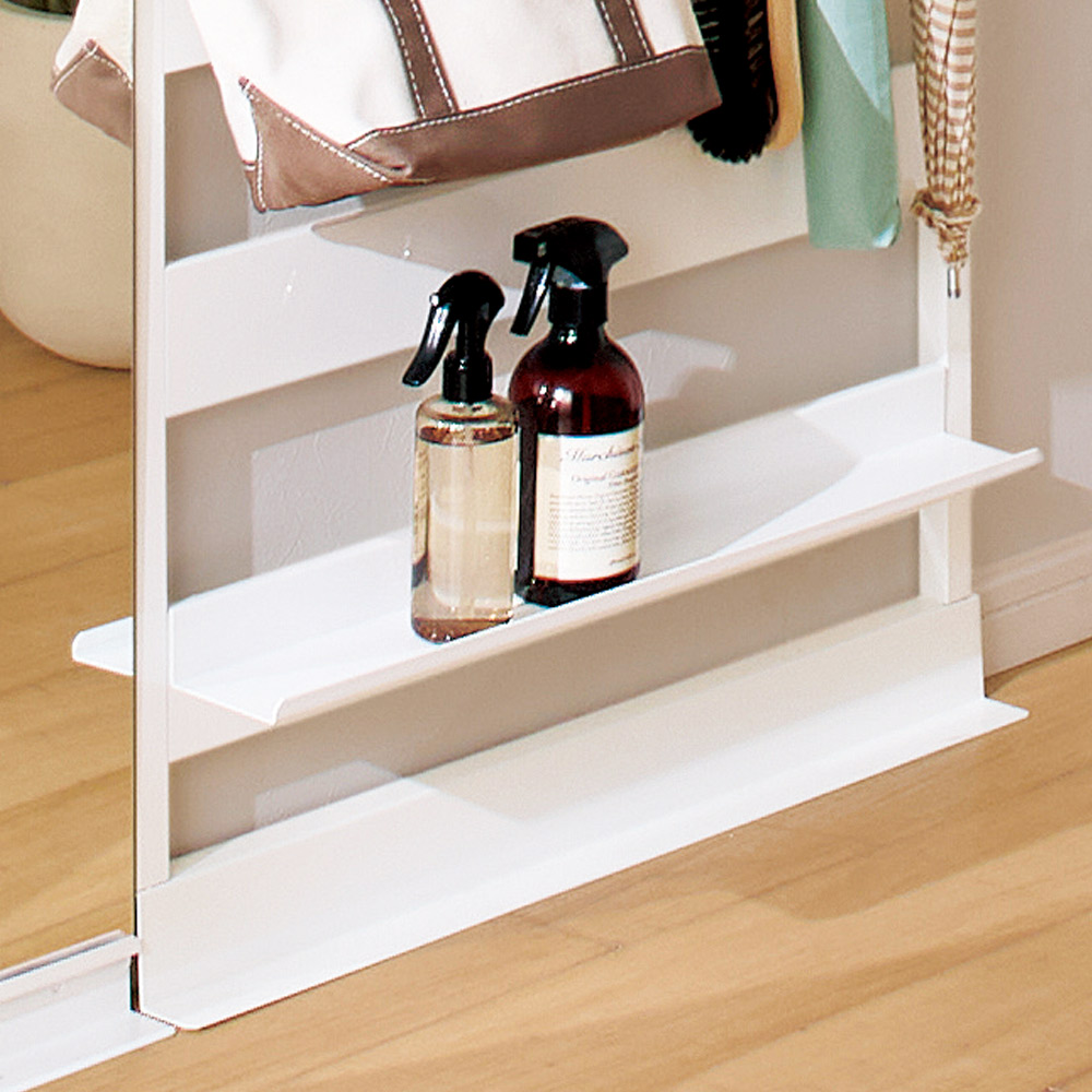 ホワイト 写真左からミラー幅40cmタイプ、ラダーラック幅65cmタイプ限られた空間の玄関も広々と靴だけではなく傘やコートなど雑多なものの収納が求められる玄関では、壁ピタシリーズの場所を取らない収納が最適。圧迫感がなく、お子さまから大人まで誰にでも自分仕様に使いやすいシンプルな構造です。空間を実際よりも広く見せるミラーの効果は、玄関のような狭い場所でこそ大きなメリットに。