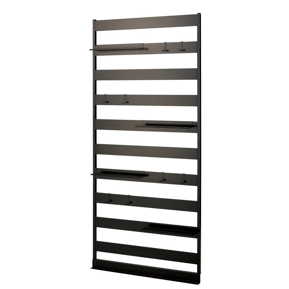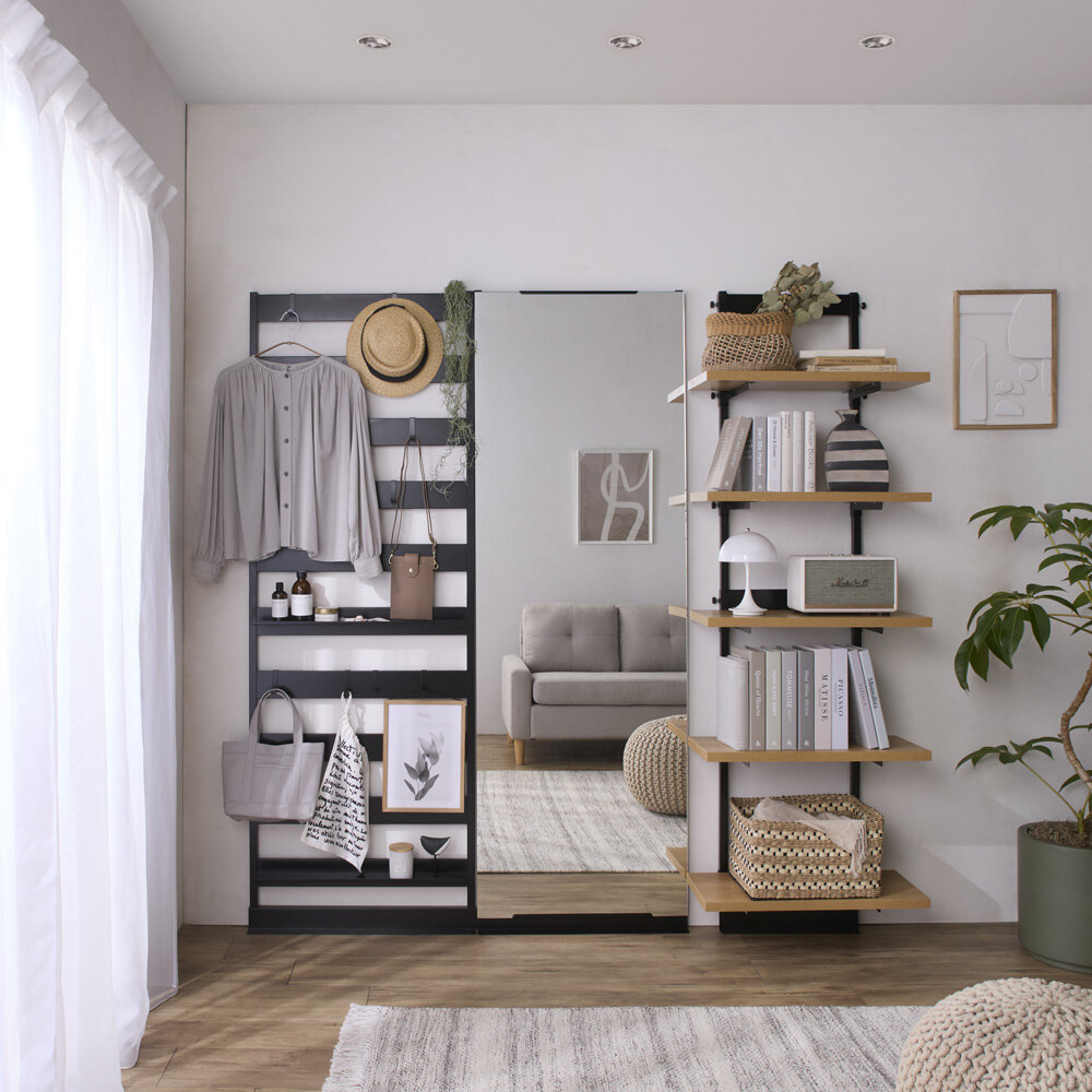 ブラック 写真左からラダーラック幅65cmタイプ、ミラー幅60cmタイプ、棚タイプ幅60cm「狭くても狭さを感じさせない」壁ピタシリーズ広さに限りがあるお部屋でも床面積をほとんど占領せずにラダーラックと棚で収納力を確保でき、ラダーの引っ掛け収納もサイドパネルのない棚も、ほどよい抜け感で圧迫感を感じさせません。さらにミラーの視覚効果で、部屋を広く見せる演出もプラスできます。