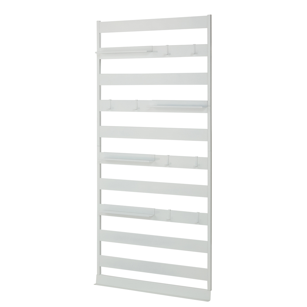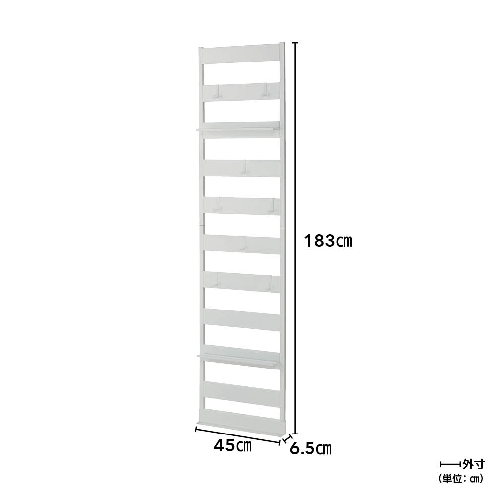 (ア)ホワイト 突っ張らないでも壁にピッタリ設置できる薄型ラック。今まで意識した事がないスペースを収納として活用できます。 ※写真は幅45cmタイプです。