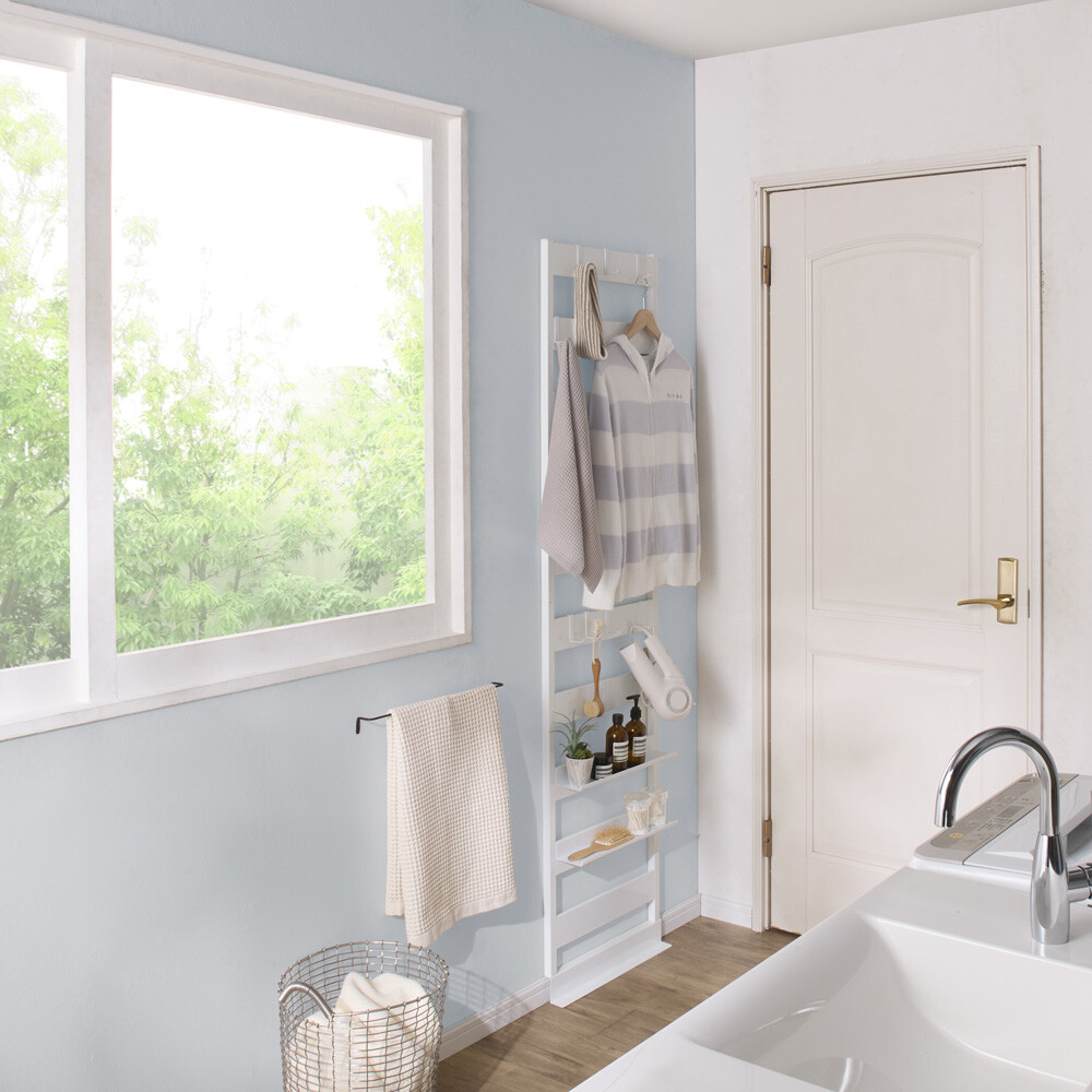 (ア)ホワイト 賃貸でも安心。石膏ボードの壁に付属の壁面固定具で誰でも簡単に設置でき、取り外し後は壁の針跡も目立ちにくいです。 ※写真左から別売りのミラー幅40cmタイプ、ラダーラック幅65cmタイプ。