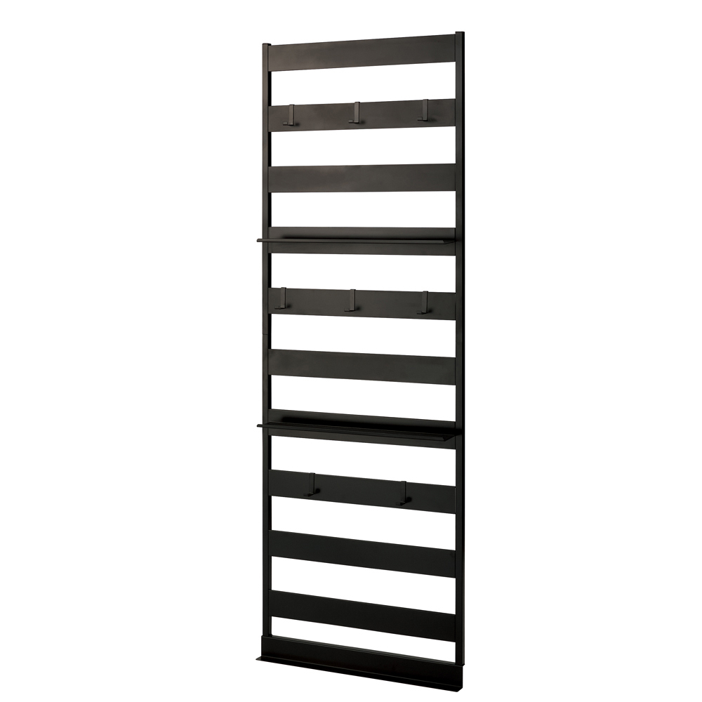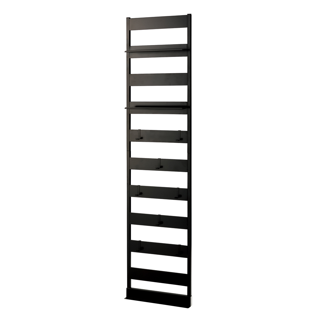 ブラック 写真左からラダーラック幅65cmタイプ、ミラー幅60cmタイプ、棚タイプ幅60cm「狭くても狭さを感じさせない」壁ピタシリーズ広さに限りがあるお部屋でも床面積をほとんど占領せずにラダーラックと棚で収納力を確保でき、ラダーの引っ掛け収納もサイドパネルのない棚も、ほどよい抜け感で圧迫感を感じさせません。さらにミラーの視覚効果で、部屋を広く見せる演出もプラスできます。