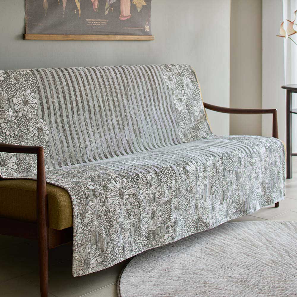上品な光沢とふっくら毛羽のあるモール状のシェニール糸で織りあげた、ジャガード織り素材が魅力を引き立てます。掛けても敷いてもズレにくく、快適